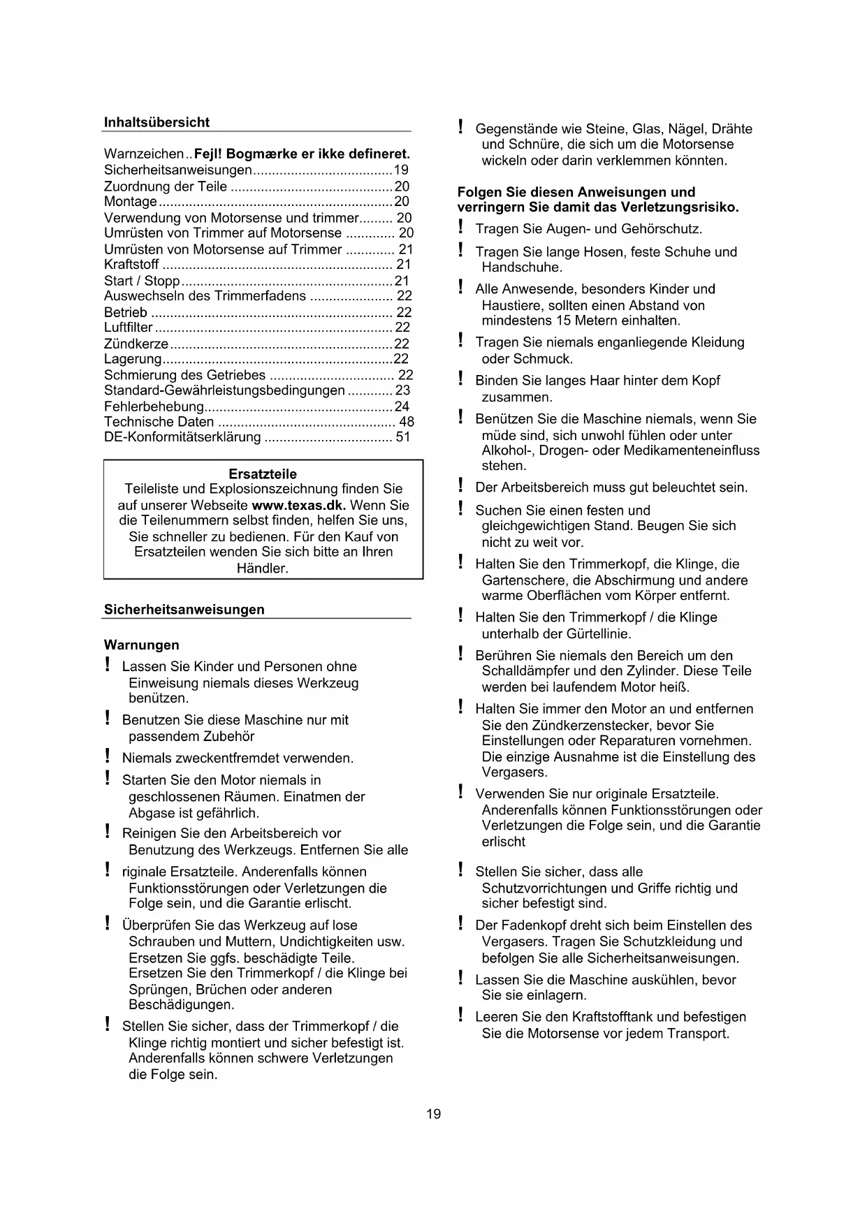 Ersatzteile Teileliste und Explosionszeichnung finden Sie auf unserer Webseite www.texas.dk. Wenn Sie die Teilenummern selbst finden, helfen Sie uns, Sie schneller zu bedienen. Für den Kauf von Ersatzteilen wenden Sie sich bitte an Ihren Händler.20