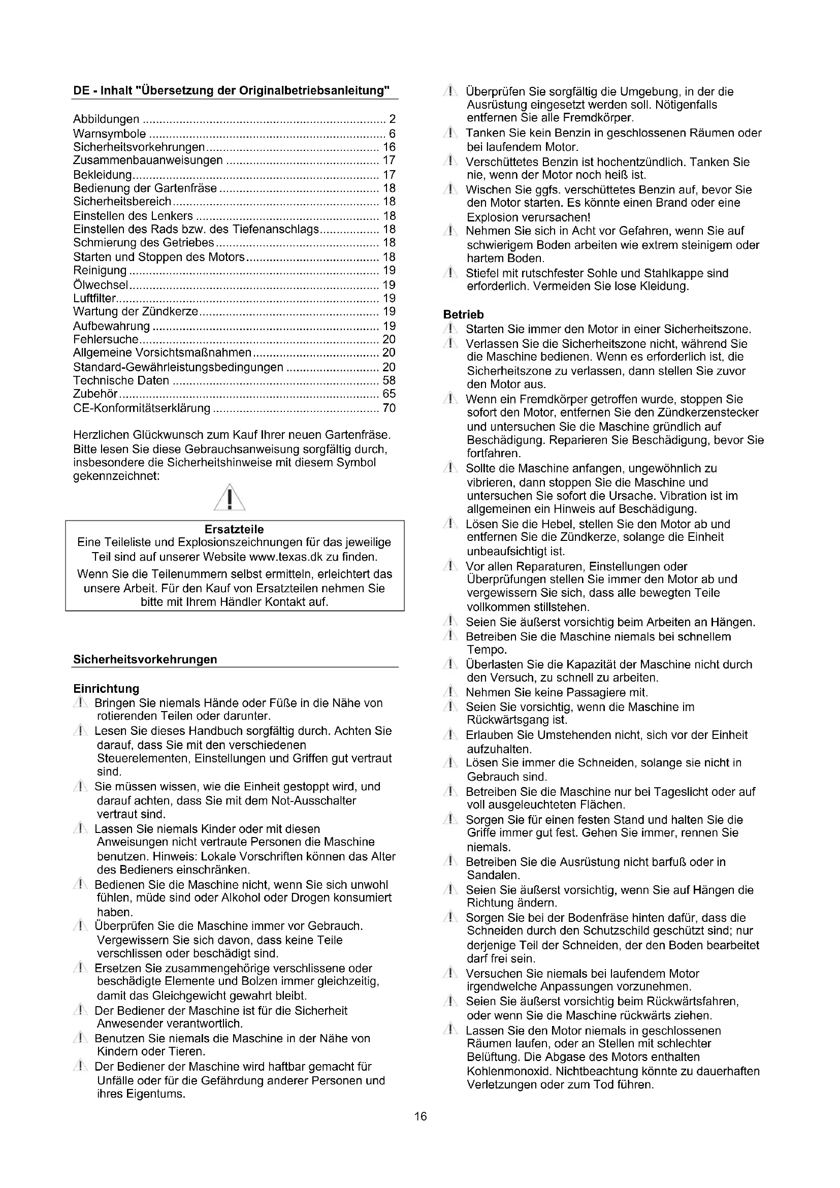 - Andere Bedingungen, für die Texas nicht verantwortlich gemacht werden kann. Inwieweit es sich bei einem Schaden um einen Garantiefall handelt oder nicht, wird von einer autorisierten Fachwerkstatt entschieden. Ihre Einkaufsquittung gilt als Garantieschein, weshalb sie sorgfältig aufbewahrt werden sollte. BEACHTEN SIE: Beim Kauf von Ersatzteilen oder der Anfrage nach Garantiereparaturen geben Sie bitte immer Jahre, Art. no. und Seriennummer an. Sie sind auf dem CE-Etikett auf der Maschine zu finden!