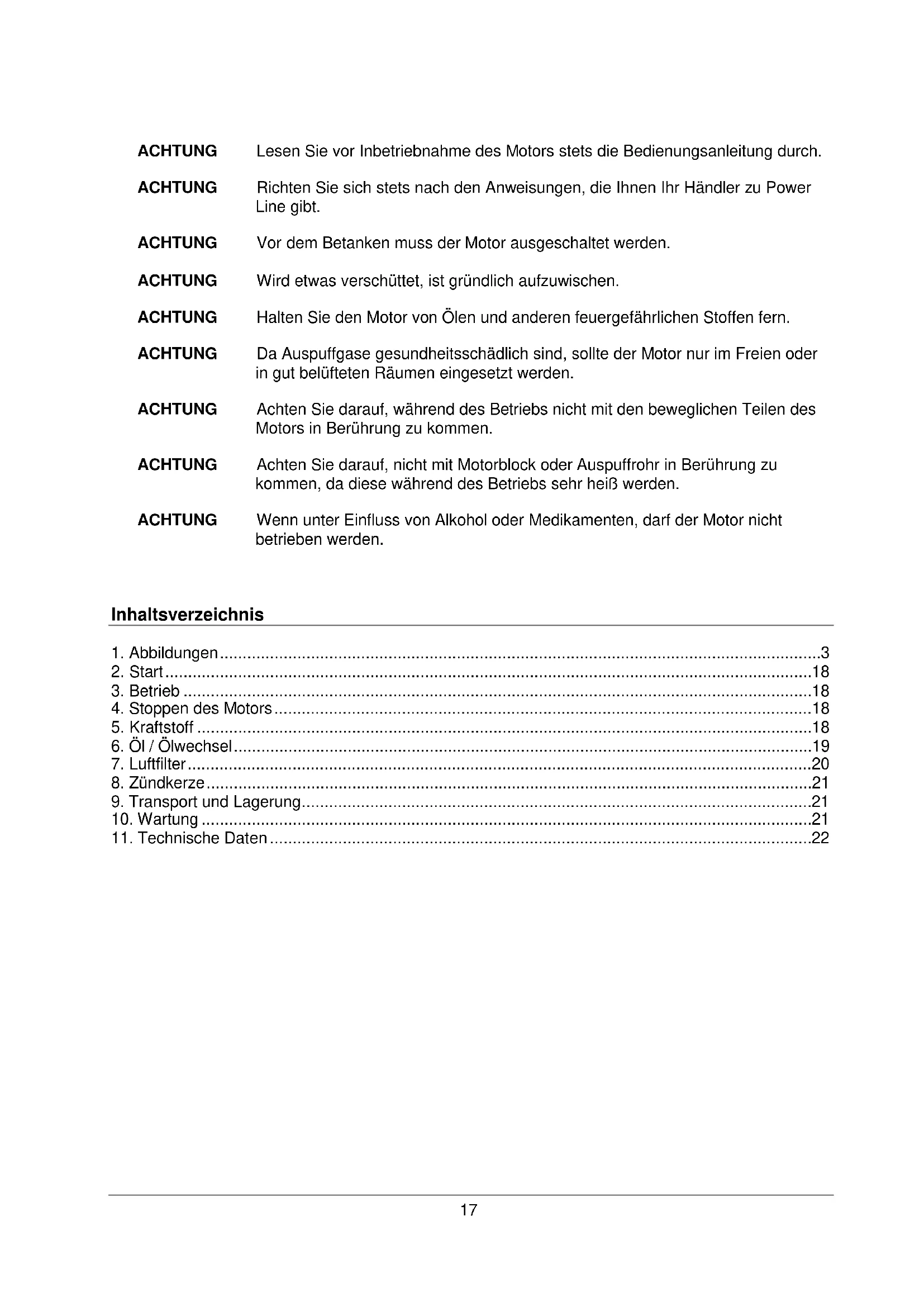 ACHTUNG Lesen Sie vor Inbetriebnahme des Motors stets die Bedienungsanleitung durch. ACHTUNG Richten Sie sich stets nach den Anweisungen, die Ihnen Ihr Händler zu Power Line gibt. ACHTUNG Vor dem Betanken muss der Motor ausgeschaltet werden. ACHTUNG Wird etwas verschüttet, ist gründlich aufzuwischen. ACHTUNG Halten Sie den Motor von Ölen und anderen feuergefährlichen Stoffen fern. ACHTUNG Da Auspuffgase gesundheitsschädlich sind, sollte der Motor nur im Freien oder in gut belüfteten Räumen eingesetzt werden. ACHTUNG Achten Sie darauf, während des Betriebs nicht mit den beweglichen Teilen des Motors in Berührung zu kommen. ACHTUNG Achten Sie darauf, nicht mit Motorblock oder Auspuffrohr in Berührung zu kommen, da diese während des Betriebs sehr heiß werden. ACHTUNG Wenn unter Einfluss von Alkohol oder Medikamenten, darf der Motor nicht betrieben werden.