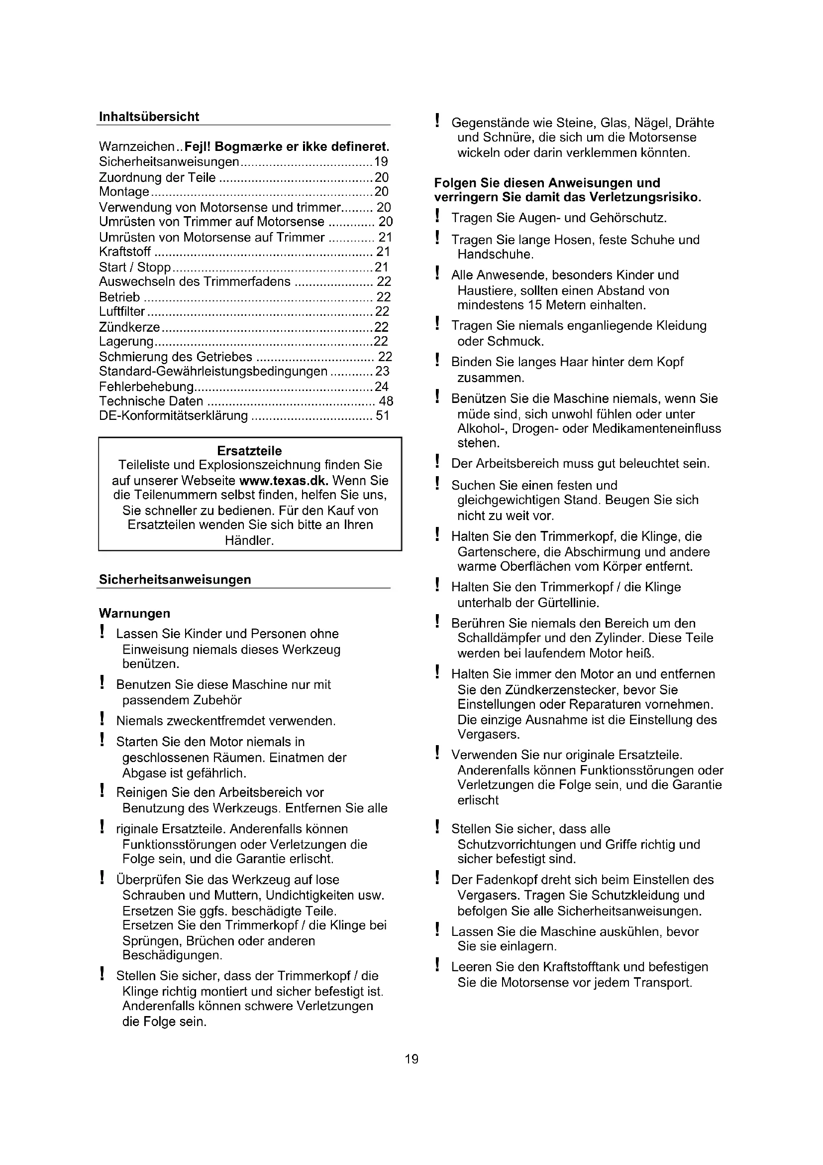 Ersatzteile Teileliste und Explosionszeichnung finden Sie auf unserer Webseite www.texas.dk. Wenn Sie die Teilenummern selbst finden, helfen Sie uns, Sie schneller zu bedienen. Für den Kauf von Ersatzteilen wenden Sie sich bitte an Ihren Händler.20