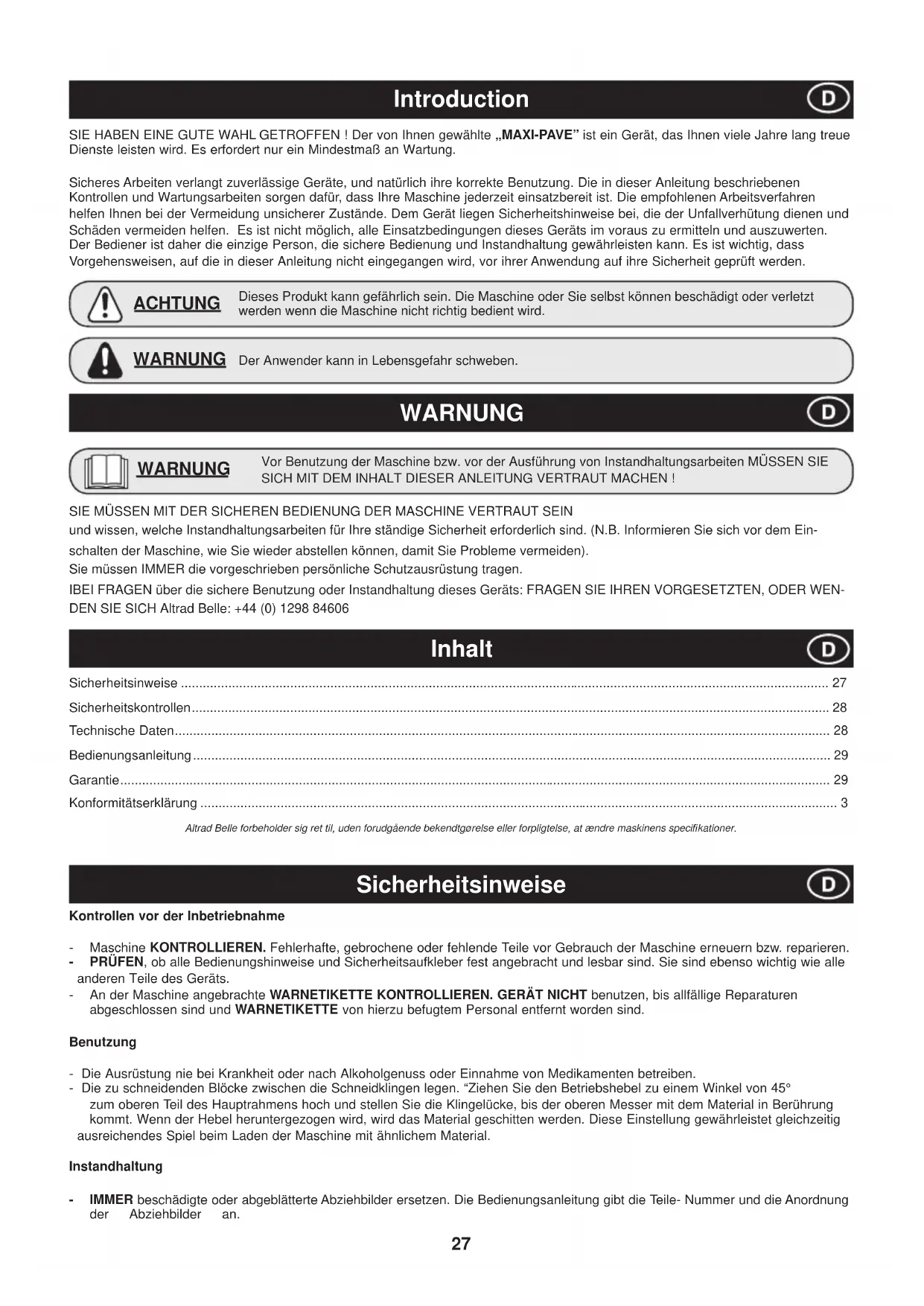 Modell Maxipave A - Länge (mm) 1170 B - Breite (mm) 315 C - Höhe (mm) 585 Max. Schnittlänge (mm) 400 Max. Steinhöhe (mm) 120 Gewicht (Kg) 35 Schnittkraft (kN) 45.629 Bedienungsanleitung Dem Erstkäufer wird für den Altrad Belle Promix eine Garantie von einem Jahr (12 Monaten) ab ursprünglichem Kaufdatum angeboten. Die Garantie der Altrad Belle deckt Konstruktions-, Material- und Herstellungsfehler. Folgendes wird nicht von der Garantie der Altrad Belle gedeckt: