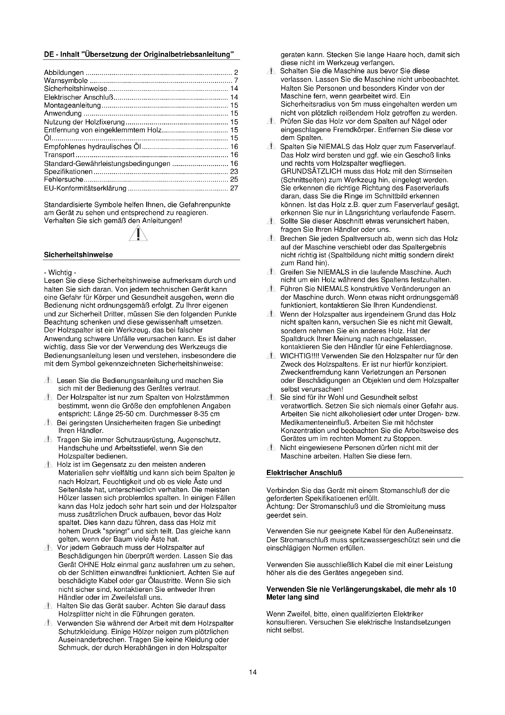Sicherheitshinweise - Wichtig - Lesen Sie diese Sicherheitshinweise aufmerksam durch und halten Sie sich daran. Von jedem technischen Gerät kann eine Gefahr für Körper und Gesundheit ausgehen, wenn die Bedienung nicht ordnungsgemäß erfolgt. Zu Ihrer eigenen und zur Sicherheit Dritter, müssen Sie den folgenden Punkte Beachtung schenken und diese gewissenhaft umsetzen. Der Holzspalter ist ein Werkzeug, das bei falscher Anwendung schwere Unfälle verursachen kann. Es ist daher wichtig, dass Sie vor der Verwendung des Werkzeugs die Bedienungsanleitung lesen und verstehen, insbesondere die mit dem Symbol gekennzeichneten Sicherheitshinweise: Lesen Sie die Bedienungsanleitung und machen Sie sich mit der Bedienung des Gerätes vertraut. Der Holzspalter ist nur zum Spalten von Holzstämmen bestimmt, wenn die Größe den empfohlenen Angaben entspricht: Länge 25-50 cm. Durchmesser 8-35 cm Bei geringsten Unsicherheiten fragen Sie unbedingt Ihren Händler. Tragen Sie immer Schutzausrüstung, Augenschutz, Handschuhe und Arbeitsstiefel, wenn Sie den Holzspalter bedienen. Holz ist im Gegensatz zu den meisten anderen Materialien sehr vielfältig und kann sich beim Spalten je nach Holzart, Feuchtigkeit und ob es viele Äste und Seitenäste hat, unterschiedlich verhalten. Die meisten Hölzer lassen sich problemlos spalten. In einigen Fällen kann das Holz jedoch sehr hart sein und der Holzspalter muss zusätzlichen Druck aufbauen, bevor das Holz spaltet. Dies kann dazu führen, dass das Holz mit hohem Druck "springt" und sich teilt. Das gleiche kann gelten, wenn der Baum viele Äste hat. Vor jedem Gebrauch muss der Holzspalter auf Beschädigungen hin überprüft werden. Lassen Sie das Gerät OHNE Holz einmal ganz ausfahren um zu sehen, ob der Schlitten einwandfrei funktioniert. Achten Sie auf beschädigte Kabel oder gar Ölaustritte. Wenn Sie sich nicht sicher sind, kontaktieren Sie entweder Ihren Händler oder im Zweifelsfall uns. Halten Sie das Gerät sauber. Achten Sie darauf dass Holzsplitter nicht in die Führungen geraten. Verwenden Sie während der Arbeit mit dem Holzspalter Schutzkleidung. Einige Hölzer neigen zum plötzlichen Auseinanderbrechen. Tragen Sie keine Kleidung oder Schmuck, der durch Herabhängen in den Holzspalter geraten kann. Stecken Sie lange Haare hoch, damit sich diese nicht im Werkzeug verfangen. Schalten Sie die Maschine aus bevor Sie diese verlassen. Lassen Sie die Maschine nicht unbeobachtet. Halten Sie Personen und besonders Kinder von der Maschine fern, wenn gearbeitet wird. Ein Sicherheitsradius von 5m muss eingehalten werden um nicht von plötzlich reißendem Holz getroffen zu werden. Prüfen Sie das Holz vor dem Spalten auf Nägel oder eingeschlagene Fremdkörper. Entfernen Sie diese vor dem Spalten. Spalten Sie NIEMALS das Holz quer zum Faserverlauf. Das Holz wird bersten und ggf. wie ein Geschoß links und rechts vom Holzspalter wegfliegen. GRUNDSÄTZLICH muss das Holz mit den Stirnseiten (Schnittseiten) zum Werkzeug hin, eingelegt werden. Sie erkennen die richtige Richtung des Faserverlaufs daran, dass Sie die Ringe im Schnittbild erkennen können. Ist das Holz z.B. quer zum Faserverlauf gesägt, erkennen Sie nur in Längsrichtung verlaufende Fasern. Sollte Sie dieser Abschnitt etwas verunsichert haben, fragen Sie Ihren Händler oder uns. Brechen Sie jeden Spaltversuch ab, wenn sich das Holz auf der Maschine verschiebt oder das Spaltergebnis nicht richtig ist (Spaltbildung nicht mittig sondern direkt zum Rand hin). Greifen Sie NIEMALS in die laufende Maschine. Auch nicht um ein Holz während des Spaltens festzuhalten. Führen Sie NIEMALS konstruktive Veränderungen an der Maschine durch. Wenn etwas nicht ordnungsgemäß funktioniert, kontaktieren Sie Ihren Kundendienst. Wenn der Holzspalter aus irgendeinem Grund das Holz nicht spalten kann, versuchen Sie es nicht mit Gewalt, sondern nehmen Sie ein anderes Holz. Hat der Spaltdruck Ihrer Meinung nach nachgelassen, kontaktieren Sie den Händler für eine Fehlerdiagnose. WICHTIG!!!! Verwenden Sie den Holzspalter nur für den Zweck des Holzspaltens. Er ist nur hierfür konzipiert. Zweckentfremdung kann Verletzungen an Personen oder Beschädigungen an Objekten und dem Holzspalter selbst verursachen! Sie sind für ihr Wohl und Gesundheit selbst veratwortlich. Setzen Sie sich niemals einer Gefahr aus. Arbeiten Sie nicht alkoholiesiert oder unter Drogen- bzw. Medikamenteneinfluß. Arbeiten Sie mit höchster Konzentration und beobachten Sie die Arbeitsweise des Gerätes um im rechten Moment zu Stoppen. Nicht eingewiesene Personen dürfen nicht mit der Maschine arbeiten. Halten Sie diese fern. Elektrischer Anschluß Verbinden Sie das Gerät mit einem Stomanschluß der die geforderten Spekifikatioenen erfüllt. Achtung: Der Stromanschluß und die Stromleitung muss geerdet sein. Verwenden Sie nur geeignete Kabel für den Außeneinsatz. Der Stromanschluß muss spritzwassergeschützt sein und die einschlägigen Normen erfüllen. Verwenden Sie ausschließlich Kabel die mit einer Leistung höher als die des Gerätes angegeben sind. Verwenden Sie nie Verlängerungskabel, die mehr als 10 Meter lang sind Wenn Zweifel, bitte, einen qualifizierten Elektriker konsultieren. Versuchen Sie elektrische Instandsetzungen nicht selbst.15