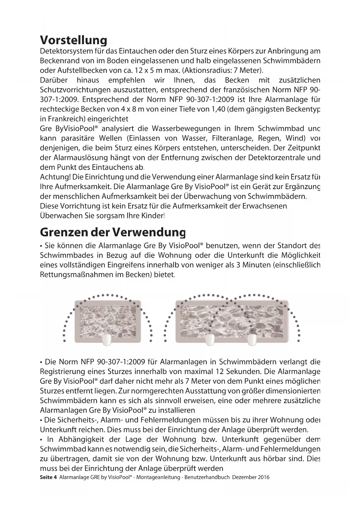 - Die Norm NFP 90-307-1:2009 für Alarmanlagen in Schwimmbädern verlangt die Registrierung eines Sturzes innerhalb von maximal 12 Sekunden. Die Alarmanlage Gre By VisioPool® darf daher nicht mehr als 7 Meter von dem Punkt eines möglichen Sturzes entfernt liegen. Zur normgerechten Ausstattung von größer dimensionierten Schwimmbädern kann es sich als sinnvoll erweisen, eine oder mehrere zusätzliche Alarmanlagen Gre By VisioPool® zu installieren.