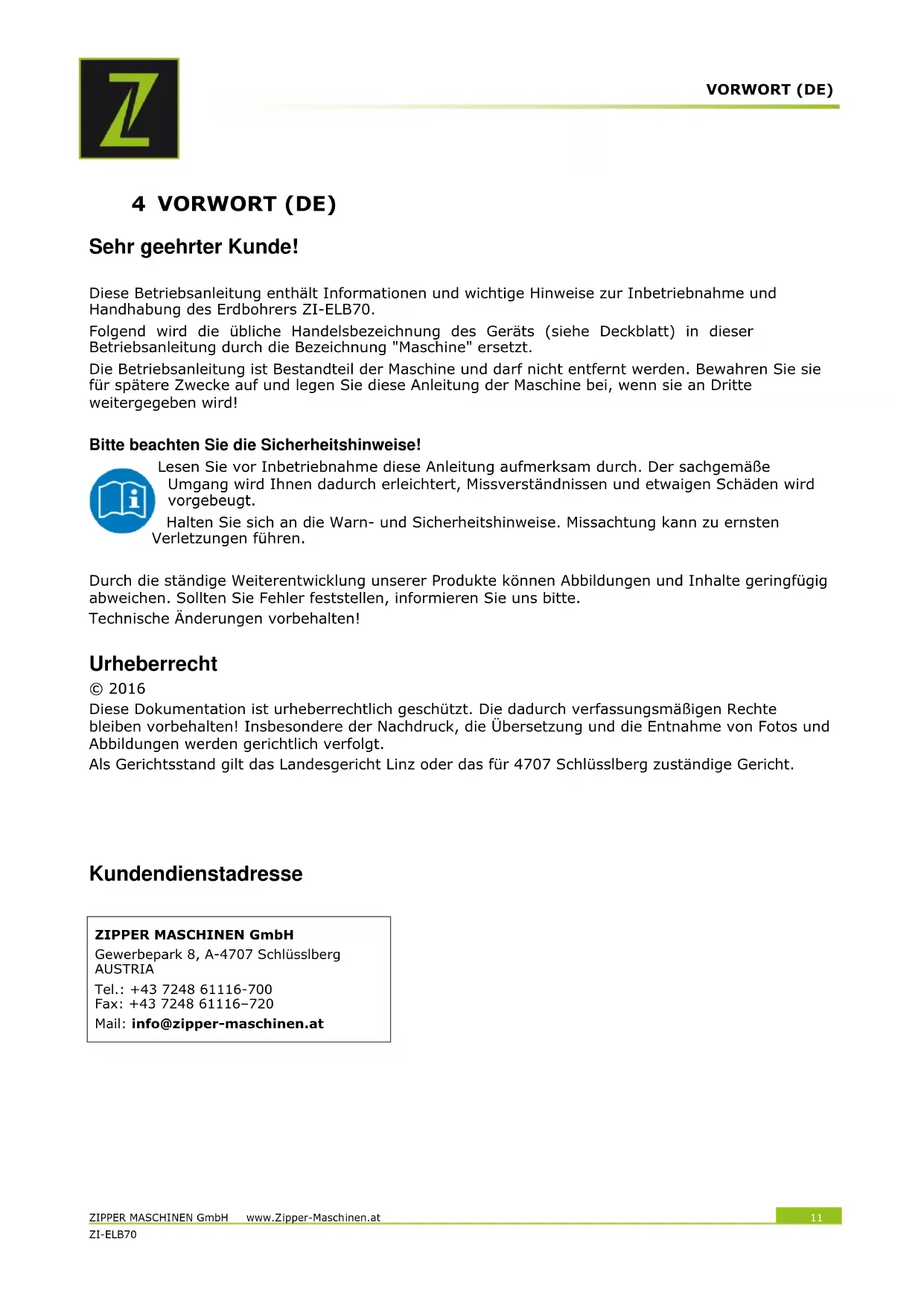 k:1,5m/s² Gewicht (ohne Bohrer) / weight (without drill) / Peso (sin taladro) / Poids (sans mèche) / Hmotnost (bez vrtáku) / Hmotnosť (bez vrtáku) / Teža (brez svedra) / Težina (bez svrdla) / Súly- fúrószár nélkül 8,5 kgVORWORT (DE) ZIPPER MASCHINEN GmbH www.Zipper-Maschinen.at 11 ZI-ELB70 11 4 VORWORT (DE) Sehr geehrter Kunde! Diese Betriebsanleitung enthält Informationen und wichtige Hinweise zur Inbetriebnahme und Handhabung des Erdbohrers ZI-ELB70. Folgend wird die übliche Handelsbezeichnung des Geräts (siehe Deckblatt) in dieser Betriebsanleitung durch die Bezeichnung "Maschine" ersetzt. Die Betriebsanleitung ist Bestandteil der Maschine und darf nicht entfernt werden. Bewahren Sie sie für spätere Zwecke auf und legen Sie diese Anleitung der Maschine bei, wenn sie an Dritte weitergegeben wird! Bitte beachten Sie die Sicherheitshinweise! Lesen Sie vor Inbetriebnahme diese Anleitung aufmerksam durch. Der sachgemäße Umgang wird Ihnen dadurch erleichtert, Missverständnissen und etwaigen Schäden wird vorgebeugt. Halten Sie sich an die Warn- und Sicherheitshinweise. Missachtung kann zu ernsten Verletzungen führen. Durch die ständige Weiterentwicklung unserer Produkte können Abbildungen und Inhalte geringfügig abweichen. Sollten Sie Fehler feststellen, informieren Sie uns bitte. Technische Änderungen vorbehalten! Urheberrecht © 2016 Diese Dokumentation ist urheberrechtlich geschützt. Die dadurch verfassungsmäßigen Rechte bleiben vorbehalten! Insbesondere der Nachdruck, die Übersetzung und die Entnahme von Fotos und Abbildungen werden gerichtlich verfolgt. Als Gerichtsstand gilt das Landesgericht Linz oder das für 4707 Schlüsslberg zuständige Gericht.