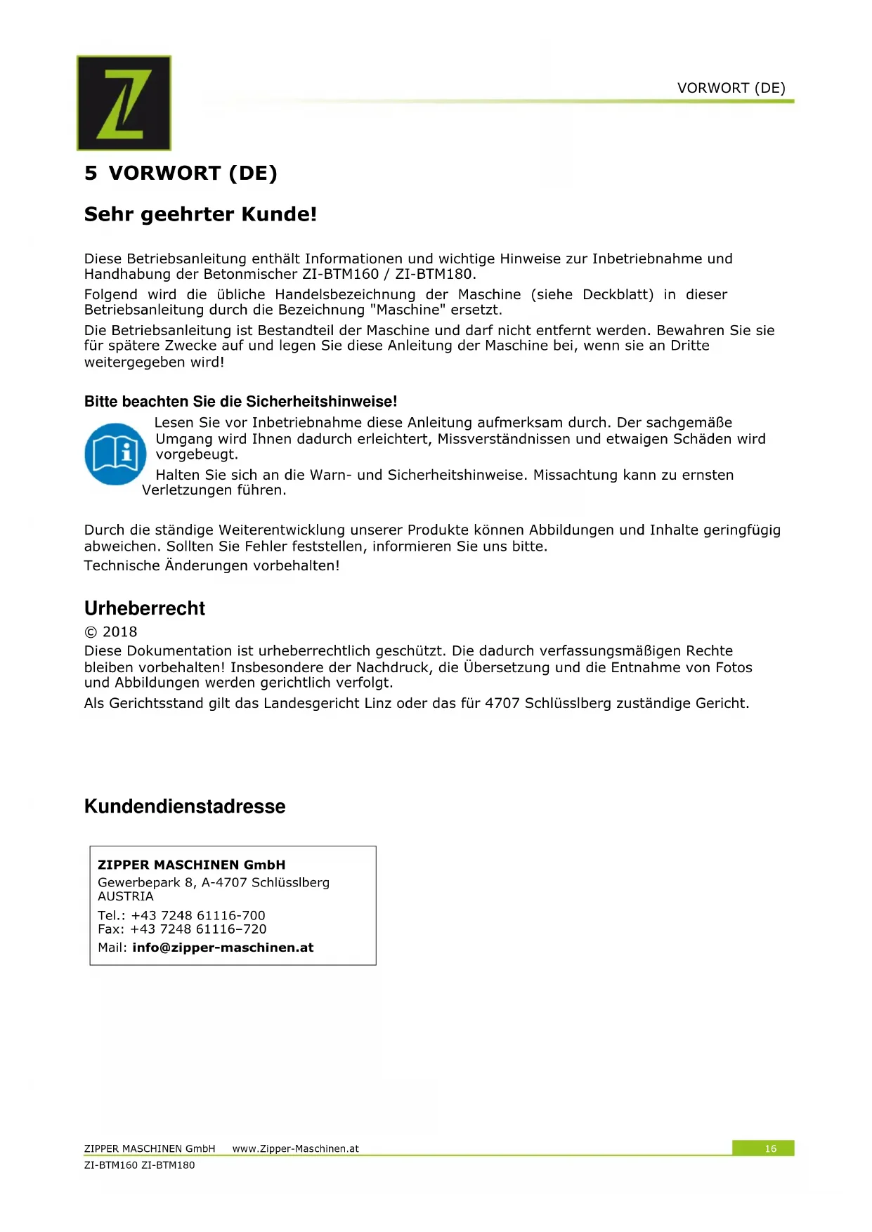 Verwenden Sie ausschließlich zulässige Verlängerungskabel mit dem, in der folgenden Tabelle erklärten, Litzenquerschnitt. Use only permitted extension cable with cross-section the one in the following table declared. Uporabljajte izključno pramenaste podaljševalne kable s preseki, ki so navedeni v spodnji tabeli. Koristite isključivo dopuštene produžne kablove s presjekom žica navedenim u sljedećoj tablici. N'utilisez que des rallonges homologuées dont la section de toron est expliquée dans le tableau suivant. Spannung / Voltage / Napetost / Napon Tension Verlängerung / Extension / Podaljšek / Produžetak / Rallonge Litzenquerschnitt / Cross-section / Presek kabla / Presjek žice / Section de toron 220 V-240 V 50 Hz <27 m 1,5 mm2 <44 m 2,5 mm2 <70 m 4,0 mm2 <105 m 6,0 mm2VORWORT (DE) ZIPPER MASCHINEN GmbH www.Zipper-Maschinen.at 16 ZI-BTM160 ZI-BTM180 5 VORWORT (DE) Sehr geehrter Kunde! Diese Betriebsanleitung enthält Informationen und wichtige Hinweise zur Inbetriebnahme und Handhabung der Betonmischer ZI-BTM160 / ZI-BTM180. Folgend wird die übliche Handelsbezeichnung der Maschine (siehe Deckblatt) in dieser Betriebsanleitung durch die Bezeichnung "Maschine" ersetzt. Die Betriebsanleitung ist Bestandteil der Maschine und darf nicht entfernt werden. Bewahren Sie sie für spätere Zwecke auf und legen Sie diese Anleitung der Maschine bei, wenn sie an Dritte weitergegeben wird! Bitte beachten Sie die Sicherheitshinweise! Lesen Sie vor Inbetriebnahme diese Anleitung aufmerksam durch. Der sachgemäße Umgang wird Ihnen dadurch erleichtert, Missverständnissen und etwaigen Schäden wird vorgebeugt. Halten Sie sich an die Warn- und Sicherheitshinweise. Missachtung kann zu ernsten Verletzungen führen. Durch die ständige Weiterentwicklung unserer Produkte können Abbildungen und Inhalte geringfügig abweichen. Sollten Sie Fehler feststellen, informieren Sie uns bitte. Technische Änderungen vorbehalten! Urheberrecht © 2018 Diese Dokumentation ist urheberrechtlich geschützt. Die dadurch verfassungsmäßigen Rechte bleiben vorbehalten! Insbesondere der Nachdruck, die Übersetzung und die Entnahme von Fotos und Abbildungen werden gerichtlich verfolgt. Als Gerichtsstand gilt das Landesgericht Linz oder das für 4707 Schlüsslberg zuständige Gericht.