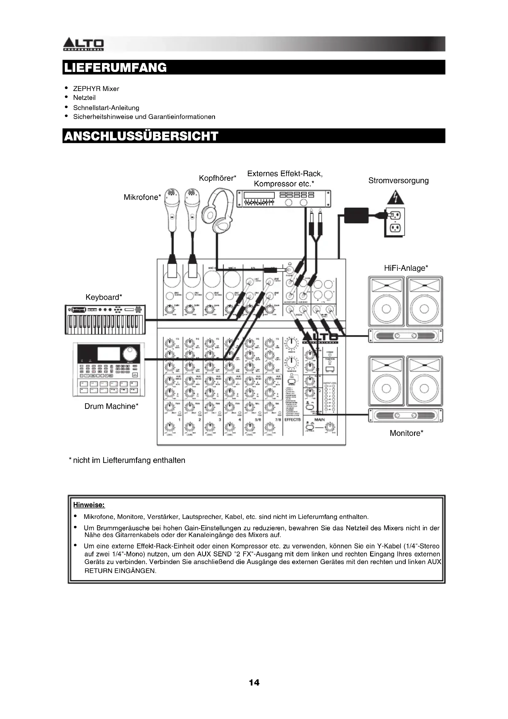 LIEFERUMFANG y ZEPHYR Mixer y Netzteil y Schnellstart-Anleitung y Sicherheitshinweise und Garantieinformationen ANSCHLUSSÜBERSICHT
