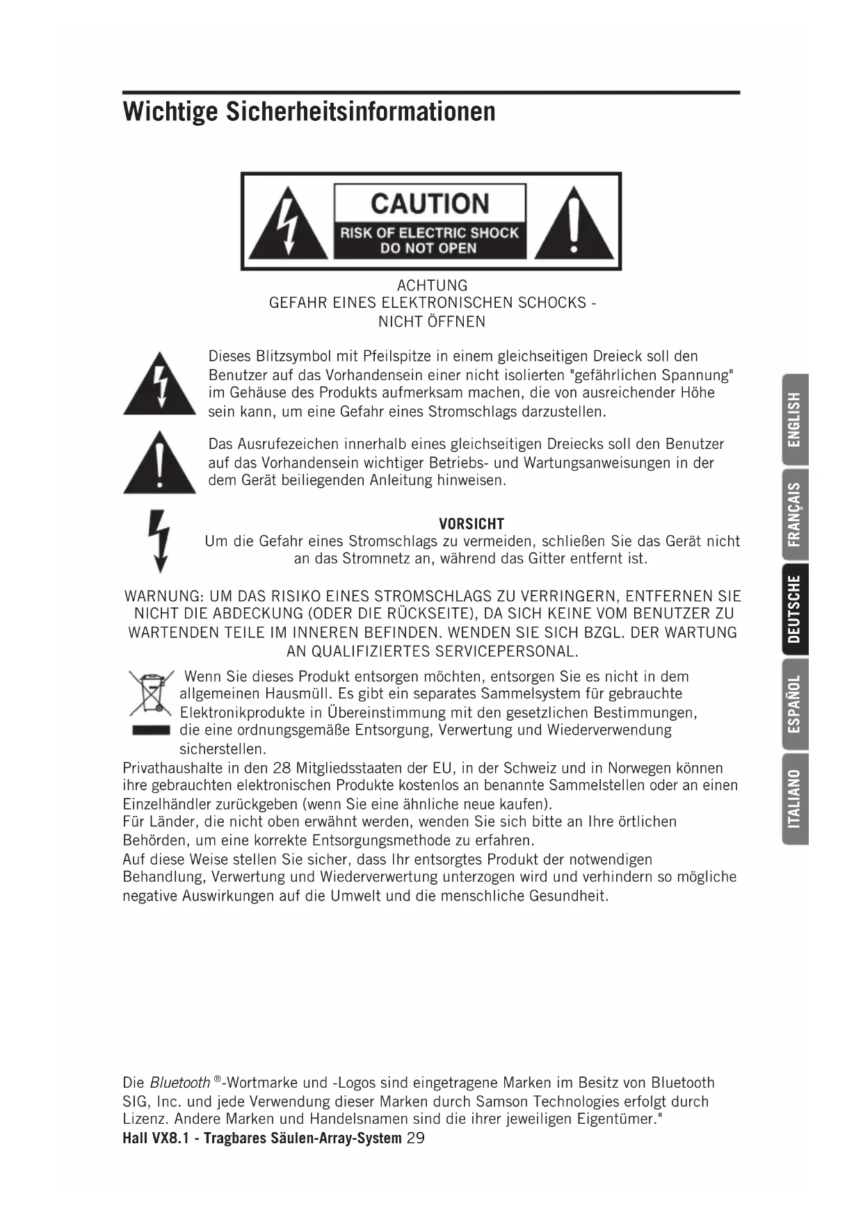 -Wortmarke und -Logos sind eingetragene Marken im Besitz von Bluetooth SIG, Inc. und jede Verwendung dieser Marken durch Samson Technologies erfolgt durch Lizenz. Andere Marken und Handelsnamen sind die ihrer jeweiligen Eigentümer." Wichtige Sicherheitsinformationen Wenn Sie dieses Produkt entsorgen möchten, entsorgen Sie es nicht in dem allgemeinen Hausmüll. Es gibt ein separates Sammelsystem für gebrauchte Elektronikprodukte in Übereinstimmung mit den gesetzlichen Bestimmungen, die eine ordnungsgemäße Entsorgung, Verwertung und Wiederverwendung sicherstellen. Privathaushalte in den 28 Mitgliedsstaaten der EU, in der Schweiz und in Norwegen können ihre gebrauchten elektronischen Produkte kostenlos an benannte Sammelstellen oder an einen Einzelhändler zurückgeben (wenn Sie eine ähnliche neue kaufen). Für Länder, die nicht oben erwähnt werden, wenden Sie sich bitte an Ihre örtlichen Behörden, um eine korrekte Entsorgungsmethode zu erfahren. Auf diese Weise stellen Sie sicher, dass Ihr entsorgtes Produkt der notwendigen Behandlung, Verwertung und Wiederverwertung unterzogen wird und verhindern so mögliche negative Auswirkungen auf die Umwelt und die menschliche Gesundheit. WARNUNG: UM DAS RISIKO EINES STROMSCHLAGS ZU VERRINGERN, ENTFERNEN SIE NICHT DIE ABDECKUNG (ODER DIE RÜCKSEITE), DA SICH KEINE VOM BENUTZER ZU WARTENDEN TEILE IM INNEREN BEFINDEN. WENDEN SIE SICH BZGL. DER WARTUNG AN QUALIFIZIERTES SERVICEPERSONAL. Dieses Blitzsymbol mit Pfeilspitze in einem gleichseitigen Dreieck soll den Benutzer auf das Vorhandensein einer nicht isolierten "gefährlichen Spannung" im Gehäuse des Produkts aufmerksam machen, die von ausreichender Höhe sein kann, um eine Gefahr eines Stromschlags darzustellen. Das Ausrufezeichen innerhalb eines gleichseitigen Dreiecks soll den Benutzer auf das Vorhandensein wichtiger Betriebs- und Wartungsanweisungen in der dem Gerät beiliegenden Anleitung hinweisen. ACHTUNG