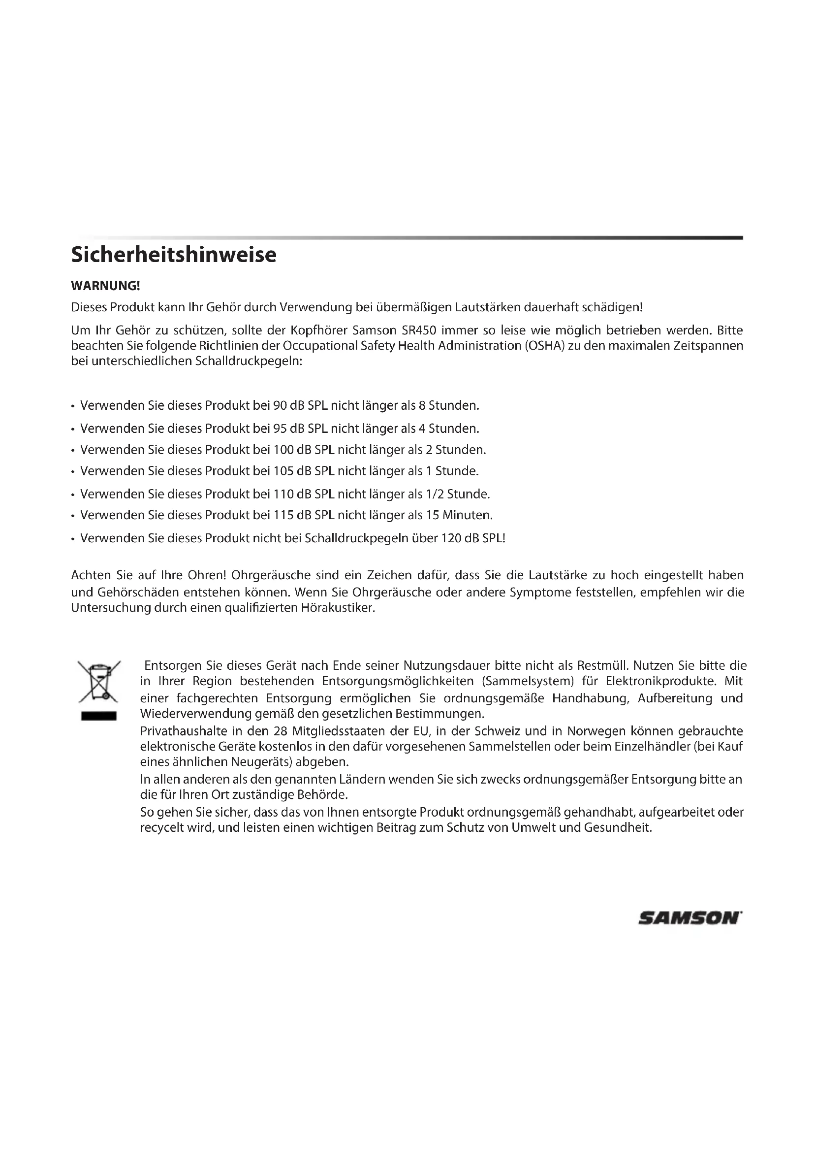 - Verwenden Sie dieses Produkt nicht bei Schalldruckpegeln über 120 dB SPL! Achten Sie auf Ihre Ohren! Ohrgeräusche sind ein Zeichen dafür, dass Sie die Lautstärke zu hoch eingestellt haben und Gehörschäden entstehen können. Wenn Sie Ohrgeräusche oder andere Symptome feststellen, empfehlen wir die Untersuchung durch einen qualizierten Hörakustiker. Entsorgen Sie dieses Gerät nach Ende seiner Nutzungsdauer bitte nicht als Restmüll. Nutzen Sie bitte die in Ihrer Region bestehenden Entsorgungsmöglichkeiten (Sammelsystem) für Elektronikprodukte. Mit einer fachgerechten Entsorgung ermöglichen Sie ordnungsgemäße Handhabung, Aufbereitung und Wiederverwendung gemäß den gesetzlichen Bestimmungen. Privathaushalte in den 28 Mitgliedsstaaten der EU, in der Schweiz und in Norwegen können gebrauchte elektronische Geräte kostenlos in den dafür vorgesehenen Sammelstellen oder beim Einzelhändler (bei Kauf eines ähnlichen Neugeräts) abgeben. In allen anderen als den genannten Ländern wenden Sie sich zwecks ordnungsgemäßer Entsorgung bitte an die für Ihren Ort zuständige Behörde. So gehen Sie sicher, dass das von Ihnen entsorgte Produkt ordnungsgemäß gehandhabt, aufgearbeitet oder recycelt wird, und leisten einen wichtigen Beitrag zum Schutz von Umwelt und Gesundheit.SR450: Studio-Referenzkopfhörer EN FR DE ES IT Einführung Herzlichen Glückwunsch zum Kauf Ihres neuen Samson SR450 On-Ear Studio-Referenzkopfhörers! Der SR450 ist ein geschlossener Kopfhörer, der für die präzise Wiedergabe Ihres Audiomaterials beim Aufnehmen, Mischen und für die Musikwiedergabe konzipiert wurde. Dank seiner 40-mm-Treiber mit Neodym-Magneten, verfügt der Kopfhörer über ei- nen Frequenzgang mit seidigen und weichen Höhen, während die Basswiedergabe warm und druckvoll ist. Das leichte ohrauiegende Design ermöglicht ermüdungsfreies Tragen des Kopfhörers bei langen Nutzungszeiten. Der SR450 verfügt über weiche Ohrpolster aus Memory-Schaumsto sowie einen einstellbaren gepolsterten Kopfbügel und sorgt so für angenehmes Tragen und sicheren Halt. Ob Sie sich entspannen, Musik hören oder Ihre digitalen Aufnah- men mischen: Der SR450 ist die richtige Wahl. Wir empfehlen Ihnen, Ihre Seriennummer in das dafür vorgesehene Feld weiter unten einzutragen – für den Fall, dass Sie diese später einmal benötigen. Seriennummer: _________________________ Kaufdatum: _________________________ Wenn Sie Ihren SR450-Kopfhörer mit angemessener Sorgfalt behandeln, wird er jahrelang problemlos funktionieren. Sollte Ihr Gerät einmal gewartet werden müssen, besorgen Sie sich vor der Rücksendung an Samson bitte eine Return Authorization (RA) Number (Rücksendeberechtigungsnummer). Ohne eine solche Nummer müssen wir das eingeschick- te Gerät leider zurückweisen. Sie können sich telefonisch unter +1-800-3SAMSON (+1-800-372-6766) an Samson wen- den. Erfragen Sie eine Umtauschberechtigungsnummer und schicken Sie anschließend Ihr Gerät ein. Bitte verwenden Sie zum Einschicken möglichst das Original-Verpackungsmaterial und den Originalkarton. Wenn Sie Ihr Samson-Produkt außerhalb der USA erworben haben, setzen Sie sich bezüglich der Garantiebedingungen und -leistungen bitte mit Ihrem lokalen Vertrieb in Verbindung Leistungsmerkmale