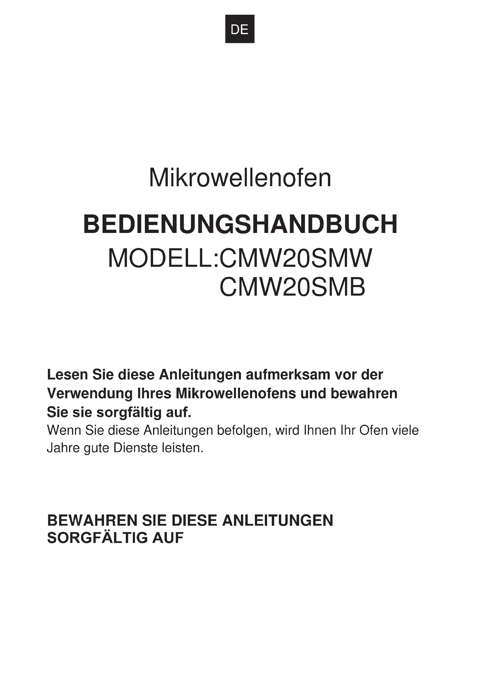 CMW20SMB Lesen Sie diese Anleitungen aufmerksam vor der Verwendung Ihres Mikrowellenofens und bewahren Sie sie sorgfältig auf. Wenn Sie diese Anleitungen befolgen, wird Ihnen Ihr Ofen viele Jahre gute Dienste leisten.