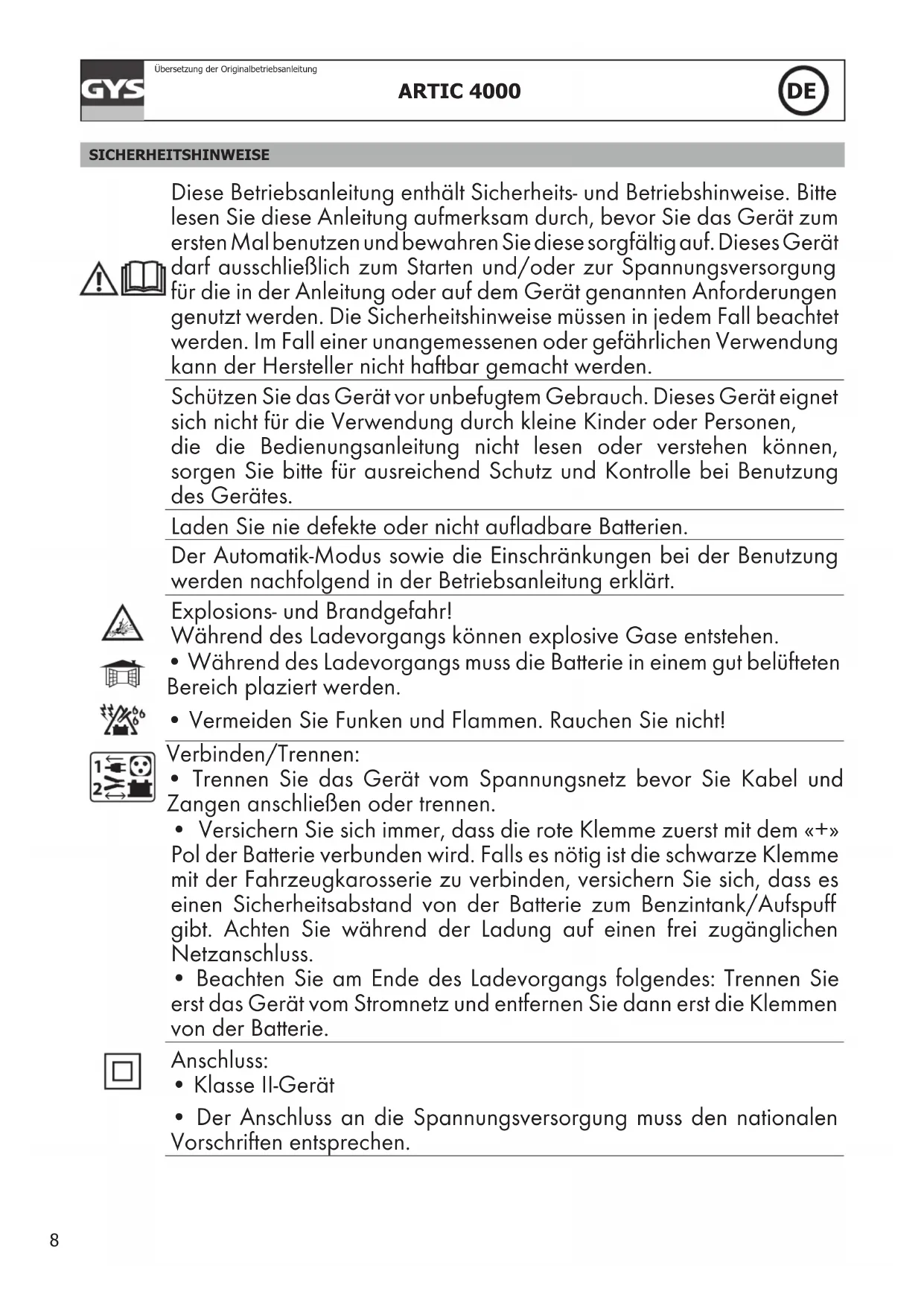- Wenn die Kontrollleuchte nach den Korrekturen ausgeschaltet bleibt, ersetzen Sie die sulfatierte oder beschädigte Batterie. Trennen der Klemmen oder der Ösen während der Ladung.Das Ladegerät wieder an die Batterie anschließen. Batteriespannung zu hoch.Prüfen Sie, ob der ausgewählte Modus der Nennspannung der Batterie entspricht. Batterie defekt oder tiefentladen. Ersetzen Sie die Batterie. HERSTELLERGARANTIE Die Garantieleistung des Herstellers erfolgt ausschließlich bei Fabrikations- oder Materialfehlern, die binnen 24 Monate nach Kauf angezeigt werden (Nachweis Kaufbeleg). Nach Anerkennung des Garantieanspruchs durch den Hersteller bzw. seines Beauftrag- ten erfolgen eine für den Käufer kostenlose Reparatur und ein kostenloser Ersatz von Ersatzteilen. Der Garantiezeitraum bleibt aufgrund erfolgter Garantieleistungen unverändert. Die Garantie erfolgt nicht bei Defekten, die durch unsachgemäßen Gebrauch, Sturz oder harte Stöße sowie durch nicht autorisierte Reparaturen oder durch Transportschäden, die in Folge des Einsendens zur Reparatur, hervorgerufen worden sind. Keine Garantie wird für Verschleißteile (z.B. Kabel, Klemmen, Vorsatzscheiben usw.) sowie bei Gebrauchsspuren übernommen. Das betreffende Gerät bitte immer mit Kaufbeleg und kurzer Fehlerbeschreibung ausschließlich über den Fachhandel einschicken. Die Reparatur erfolgt erst nach Erhalt einer schriftlichen Akzeptanz (unterschrift) des zuvor vorgelegten Kostenvoranschlags durch den Besteller. Im Fall einer Garantieleistung trägt GYS ausschließlich die Kosten für den Rückversand an den Fachhändler.11 ARTIC 4000