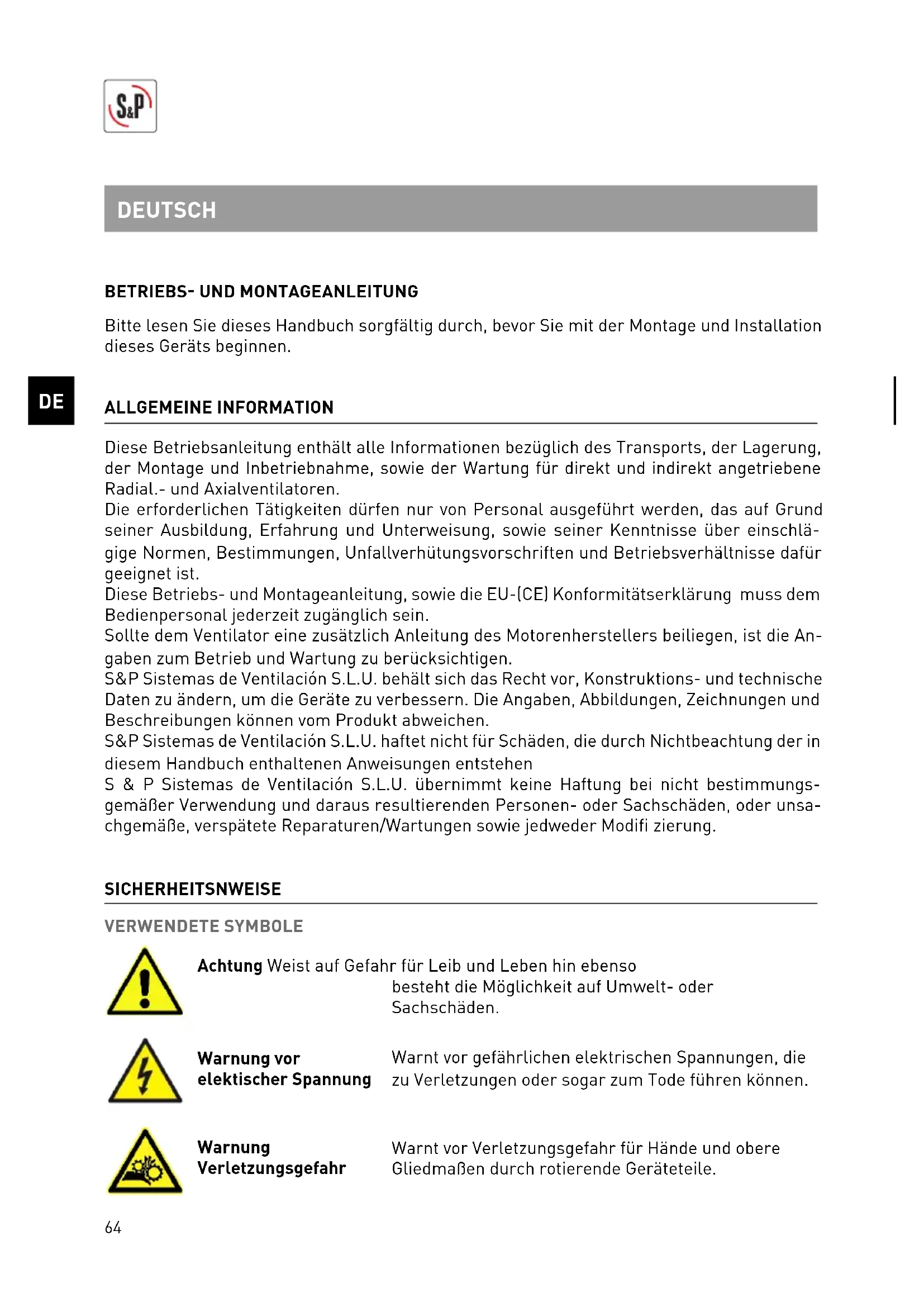 Bitte lesen Sie dieses Handbuch sorgfältig durch, bevor Sie mit der Montage und Installation dieses Geräts beginnen. ALLGEMEINE INFORMATION Diese Betriebsanleitung enthält alle Informationen bezüglich des Transports, der Lagerung, der Montage und Inbetriebnahme, sowie der Wartung für direkt und indirekt angetriebene Radial.- und Axialventilatoren. Die erforderlichen Tätigkeiten dürfen nur von Personal ausgeführt werden, das auf Grund seiner Ausbildung, Erfahrung und Unterweisung, sowie seiner Kenntnisse über einschlä- gige Normen, Bestimmungen, Unfallverhütungsvorschriften und Betriebsverhältnisse dafür geeignet ist. Diese Betriebs- und Montageanleitung, sowie die EU-(CE) Konformitätserklärung muss dem Bedienpersonal jederzeit zugänglich sein. Sollte dem Ventilator eine zusätzlich Anleitung des Motorenherstellers beiliegen, ist die An- gaben zum Betrieb und Wartung zu berücksichtigen. S&P Sistemas de Ventilación S.L.U. behält sich das Recht vor, Konstruktions- und technische Daten zu ändern, um die Geräte zu verbessern. Die Angaben, Abbildungen, Zeichnungen und Beschreibungen können vom Produkt abweichen. S&P Sistemas de Ventilación S.L.U. haftet nicht für Schäden, die durch Nichtbeachtung der in diesem Handbuch enthaltenen Anweisungen entstehen S & P Sistemas de Ventilación S.L.U. übernimmt keine Haftung bei nicht bestimmungs- gemäßer Verwendung und daraus resultierenden Personen- oder Sachschäden, oder unsa- chgemäße, verspätete Reparaturen/Wartungen sowie jedweder Modifi zierung. SICHERHEITSNWEISE VERWENDETE SYMBOLE Achtung Weist auf Gefahr für Leib und Leben hin ebenso besteht die Möglichkeit auf Umwelt- oder Sachschäden. Warnung vor elektischer Spannung Warnt vor gefährlichen elektrischen Spannungen, die zu Verletzungen oder sogar zum Tode führen können. Warnung Verletzungsgefahr Warnt vor Verletzungsgefahr für Hände und obere Gliedmaßen durch rotierende Geräteteile. DEUTSCH65
