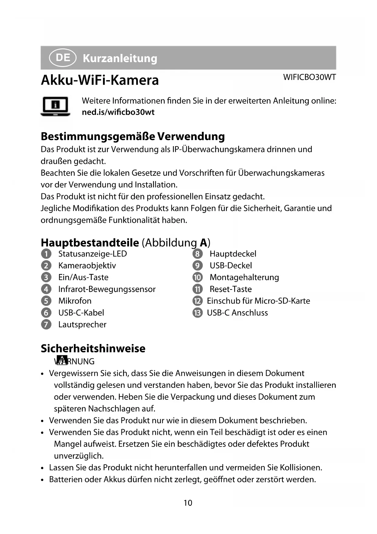 Kurzanleitung Akku-WiFi-Kamera WIFICBO30WTWeitere Informationen nden Sie in der erweiterten Anleitung online: ned.is/wicbo30wt Bestimmungsgemäße Verwendung Das Produkt ist zur Verwendung als IP-Überwachungskamera drinnen und draußen gedacht.Beachten Sie die lokalen Gesetze und Vorschriften für Überwachungskameras vor der Verwendung und Installation.Das Produkt ist nicht für den professionellen Einsatz gedacht.Jegliche Modikation des Produkts kann Folgen für die Sicherheit, Garantie und ordnungsgemäße Funktionalität haben. Hauptbestandteile (Abbildung A) 1 Statusanzeige-LED 2 Kameraobjektiv 3 Ein/Aus-Taste 4 Infrarot-Bewegungssensor 5 Mikrofon 6 USB-C-Kabel 7 Lautsprecher 8 Hauptdeckel 9 USB-Deckel q Montagehalterung w Reset-Taste e Einschub für Micro-SD-Karte r USB-C Anschluss Sicherheitshinweise