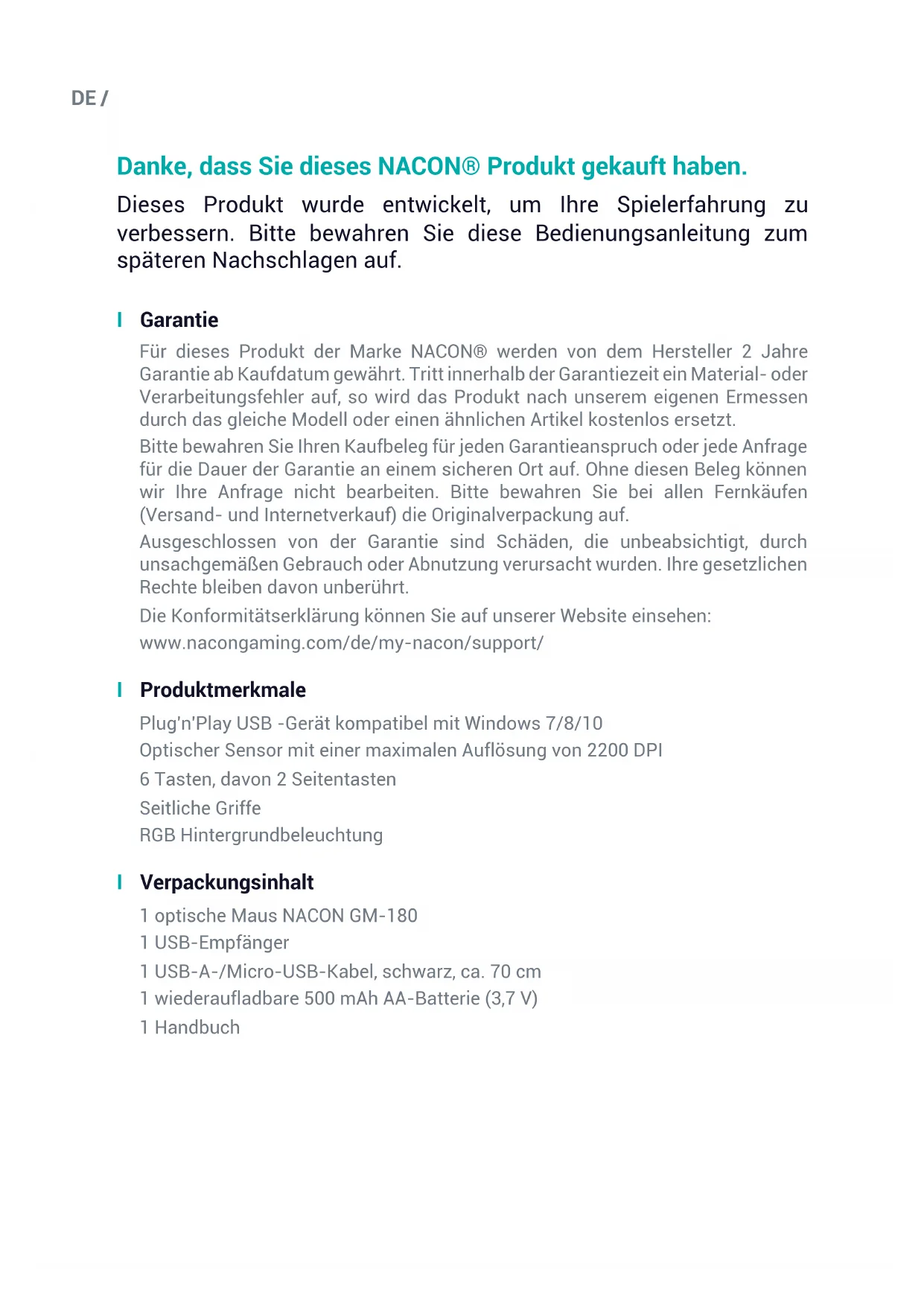 Danke, dass Sie dieses NACON® Produkt gekauft haben. Dieses Produkt wurde entwickelt, um Ihre Spielerfahrung zu verbessern. Bitte bewahren Sie diese Bedienungsanleitung zum späteren Nachschlagen auf. I Garantie Für dieses Produkt der Marke NACON® werden von dem Hersteller 2 Jahre Garantie ab Kaufdatum gewährt. Tritt innerhalb der Garantiezeit ein Material- oder Verarbeitungsfehler auf, so wird das Produkt nach unserem eigenen Ermessen durch das gleiche Modell oder einen ähnlichen Artikel kostenlos ersetzt. Bitte bewahren Sie Ihren Kaufbeleg für jeden Garantieanspruch oder jede Anfrage für die Dauer der Garantie an einem sicheren Ort auf. Ohne diesen Beleg können wir Ihre Anfrage nicht bearbeiten. Bitte bewahren Sie bei allen Fernkäufen (Versand- und Internetverkauf) die Originalverpackung auf. Ausgeschlossen von der Garantie sind Schäden, die unbeabsichtigt, durch unsachgemäßen Gebrauch oder Abnutzung verursacht wurden. Ihre gesetzlichen Rechte bleiben davon unberührt. Die Konformitätserklärung können Sie auf unserer Website einsehen: www.nacongaming.com/de/my-nacon/support/ I Produktmerkmale Plug'n'Play USB -Gerät kompatibel mit Windows 7/8/10 Optischer Sensor mit einer maximalen Auflösung von 2200 DPI 6 Tasten, davon 2 Seitentasten Seitliche Griffe RGB Hintergrundbeleuchtung I Verpackungsinhalt 1 optische Maus NACON GM-180 1 USB-Empfänger 1 USB-A-/Micro-USB-Kabel, schwarz, ca. 70 cm 1 wiederaufladbare 500 mAh AA-Batterie (3,7 V) 1 HandbuchDE / I Steuerelemente