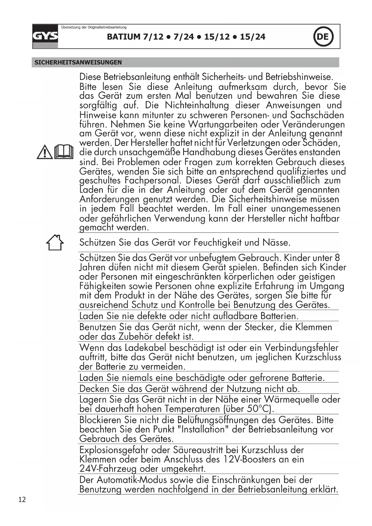 Übersetzung der Originalbetriebsanleitung SICHERHEITSANWEISUNGEN Diese Betriebsanleitung enthält Sicherheits- und Betriebshinweise. Bitte lesen Sie diese Anleitung aufmerksam durch, bevor Sie das Gerät zum ersten Mal benutzen und bewahren Sie diese sorgfältig auf. Die Nichteinhaltung dieser Anweisungen und Hinweise kann mitunter zu schweren Personen- und Sachschäden führen. Nehmen Sie keine Wartungarbeiten oder Veränderungen am Gerät vor, wenn diese nicht explizit in der Anleitung genannt werden. Der Hersteller haftet nicht für Verletzungen oder Schäden, die durch unsachgemäße Handhabung dieses Gerätes enstanden sind. Bei Problemen oder Fragen zum korrekten Gebrauch dieses Gerätes, wenden Sie sich bitte an entsprechend qualiziertes und geschultes Fachpersonal. Dieses Gerät darf ausschließlich zum Laden für die in der Anleitung oder auf dem Gerät genannten Anforderungen genutzt werden. Die Sicherheitshinweise müssen in jedem Fall beachtet werden. Im Fall einer unangemessenen oder gefährlichen Verwendung kann der Hersteller nicht haftbar gemacht werden. Schützen Sie das Gerät vor Feuchtigkeit und Nässe. Schützen Sie das Gerät vor unbefugtem Gebrauch. Kinder unter 8 Jahren düfen nicht mit diesem Gerät spielen. Benden sich Kinder oder Personen mit eingeschränkten körperlichen oder geistigen Fähigkeiten sowie Personen ohne explizite Erfahrung im Umgang mit dem Produkt in der Nähe des Gerätes, sorgen Sie bitte für ausreichend Schutz und Kontrolle bei Benutzung des Gerätes. Laden Sie nie defekte oder nicht auadbare Batterien. Benutzen Sie das Gerät nicht, wenn der Stecker, die Klemmen oder das Zubehör defekt ist. Wenn das Ladekabel beschädigt ist oder ein Verbindungsfehler auftritt, bitte das Gerät nicht benutzen, um jeglichen Kurzschluss der Batterie zu vermeiden. Laden Sie niemals eine beschädigte oder gefrorene Batterie. Decken Sie das Gerät während der Nutzung nicht ab. Lagern Sie das Gerät nicht in der Nähe einer Wärmequelle oder bei dauerhaft hohen Temperaturen (über 50°C). Blockieren Sie nicht die Belüftungsöffnungen des Gerätes. Bitte beachten Sie den Punkt "Installation" der Betriebsanleitung vor Gebrauch des Gerätes. Explosionsgefahr oder Säureaustritt bei Kurzschluss der Klemmen oder beim Anschluss des 12V-Boosters an ein 24V-Fahrzeug oder umgekehrt. Der Automatik-Modus sowie die Einschränkungen bei der Benutzung werden nachfolgend in der Betriebsanleitung erklärt.BATIUM 7/12 • 7/24 • 15/12 • 15/24