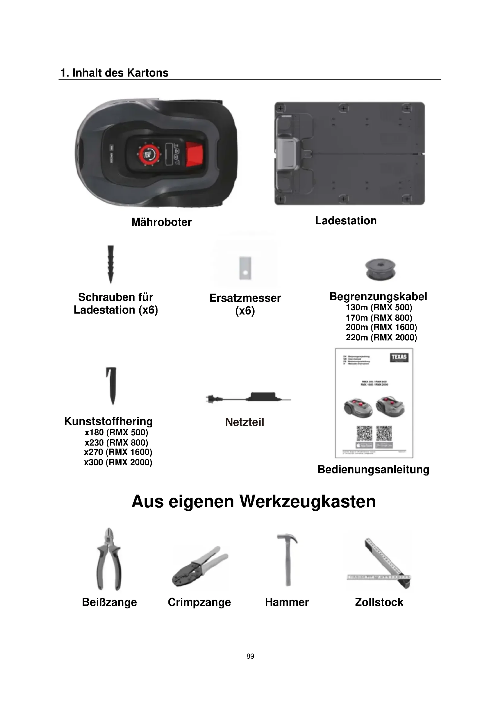 Mähroboter Ladestation Schrauben für Ladestation (x6) Ersatzmesser (x6) Begrenzungskabel 130m (RMX 500) 170m (RMX 800) 200m (RMX 1600) 220m (RMX 2000) Kunststoffhering x180 (RMX 500) x230 (RMX 800) x270 (RMX 1600) x300 (RMX 2000) Netzteil Bedienungsanleitung Beißzange Crimpzange Hammer Zollstock Aus eigenen Werkzeugkasten90
