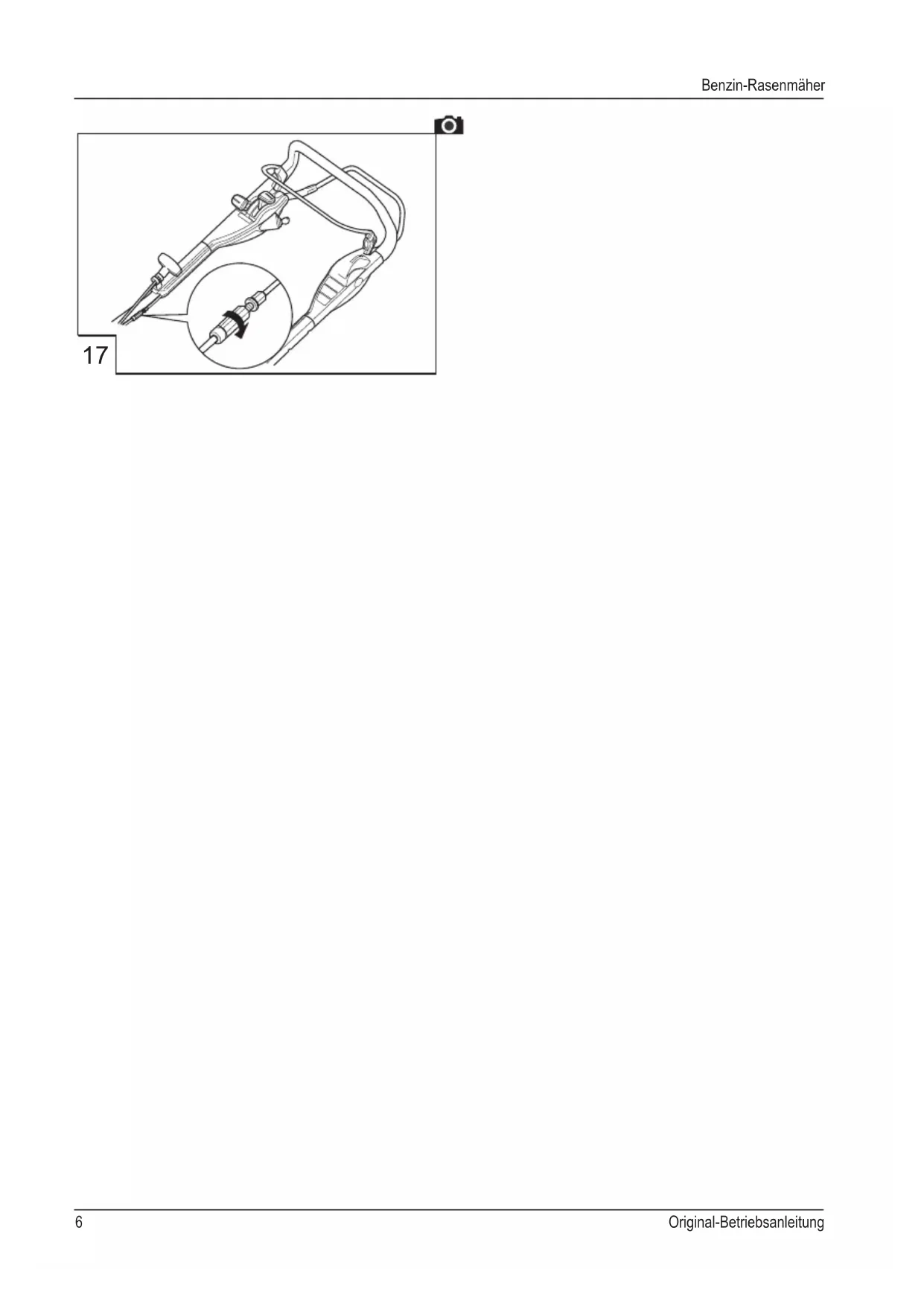 - Hilfe bei Störungen Zu diesem Handbuch Lesen Sie diese Dokumentation vor der Inbetrieb- nahme durch. Dies ist Voraussetzung für sicheres Arbeiten und störungsfreie Handhabung. Machen Sie sich vor der Benutzung mit den Bedienele- menten und dem Gebrauch der Maschine vertraut. Beachten Sie die Sicherheits- und Warnhinweise in dieser Dokumentation und auf dem Gerät Diese Dokumentation ist permanenter Bestandteil des beschriebenen Produkts und sollte bei Veräu- ßerung dem Käufer mit übergeben werden Zeichenerklärung Achtung! Genaues Befolgen dieser Warnhinweise kann Personen- und / oder Sachschäden vermeiden. Spezielle Hinweise zur besseren Verständlichkeit und Handhabung. Das Kamerasymbol verweist auf Abbildungen. Produktbeschreibung In dieser Dokumentation werden verschiedene Modelle von Benzin-Rasenmähern beschrieben. Einige Modelle sind mit Grasfangbox ausgerüstet und/oder sind zusätz- lich zum Mulchen geeignet. Identizieren Sie ihr Modell anhand der Produktbilder und der Beschreibung der verschiedenen Optionen. Bestimmungsgemäße Verwendung Dieses Gerät ist zum Mähen eines Rasenbodens im pri- vaten Bereich bestimmt und darf nur auf abgetrocknetem Rasen eingesetzt werden. Eine andere oder darüber hinausgehende Verwendung, gilt als nicht bestimmungsgemäß. Möglicher Fehlgebrauch Dieser Rasenmäher ist nicht zur Verwendung in öf- fentlichen Anlagen, Parks, Sportstätten sowie in der Land- und Forstwirtschaft geeignet Sicherheitseinrichtungen dürfen nicht demontiert oder überbrückt werden Das Gerät nicht bei Regen oder auf nassem Rasen benutzen Das Gerät darf nicht im gewerblichen Einsatz be- trieben werden Sicherheits- und Schutzeinrichtungen Achtung - Verletzungsgefahr! Sicherheits- und Schutzeinrichtungen dürfen nicht außer Kraft gesetzt werden! Sicherheitsbügel Das Gerät ist mit einem Sicherheitsbügel ausgerüstet. Im Gefahrenmoment Sicherheitsbügel loslassen. Schneidmesser wird gestoppt Motor wird gestoppt Prallklappe Die Prallklappe schützt vor herausschleudernden Teilen. Zündschlüssel (Bei Elektro-Start Modellen) DenZündschlüsselvorallenWartungsarbeiten,Pege- arbeiten, Lagerung und nach Gebrauch abziehen, um ein versehentliches Starten zu vermeiden.DE Original-Betriebsanleitung p. 16