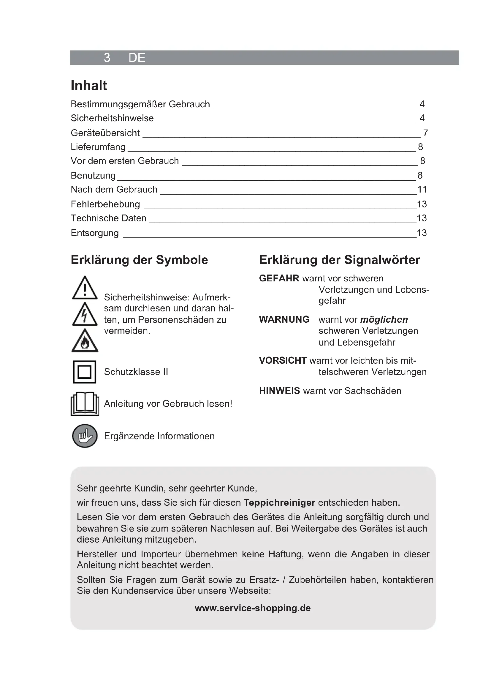 Handleiding vanaf pagina 36 071073 DE Inhalt Bestimmungsgemäßer Gebrauch _______________________________________ 4 Sicherheitshinweise _________________________________________________ 4 Geräteübersicht _____________________________________________________ 7 Lieferumfang _______________________________________________________ 8 Vor dem ersten Gebrauch _____________________________________________ 8 Benutzung _________________________________________________________ 8 Nach dem Gebrauch _________________________________________________11 Fehlerbehebung ____________________________________________________13 Technische Daten ___________________________________________________13 Entsorgung ________________________________________________________13 Sehr geehrte Kundin, sehr geehrter Kunde, wir freuen uns, dass Sie sich für diesen Teppichreiniger entschieden haben. Lesen Sie vor dem ersten Gebrauch des Gerätes die Anleitung sorgfältig durch und bewahren Sie sie zum späteren Nachlesen auf. Bei Weitergabe des Gerätes ist auch diese Anleitung mitzugeben. Hersteller und Importeur übernehmen keine Haftung, wenn die Angaben in dieser Anleitung nicht beachtet werden. Sollten Sie Fragen zum Gerät sowie zu Ersatz- / Zubehörteilen haben, kontaktieren Sie den Kundenservice über unsere Webseite: www.service-shopping.de Erklärung der Symbole Sicherheitshinweise: Aufmerk- sam durchlesen und daran hal- ten, um Personenschäden zu vermeiden. Schutzklasse II Anleitung vor Gebrauch lesen! Ergänzende Informationen Erklärung der Signalwörter GEFAHR warnt vor schweren Verletzungen und Lebens- gefahr WARNUNG warnt vor möglichen schweren Verletzungen und Lebensgefahr VORSICHT warnt vor leichten bis mit- telschweren Verletzungen HINWEIS warnt vor SachschädenDE 4 Bestimmungsgemäßer Gebrauch