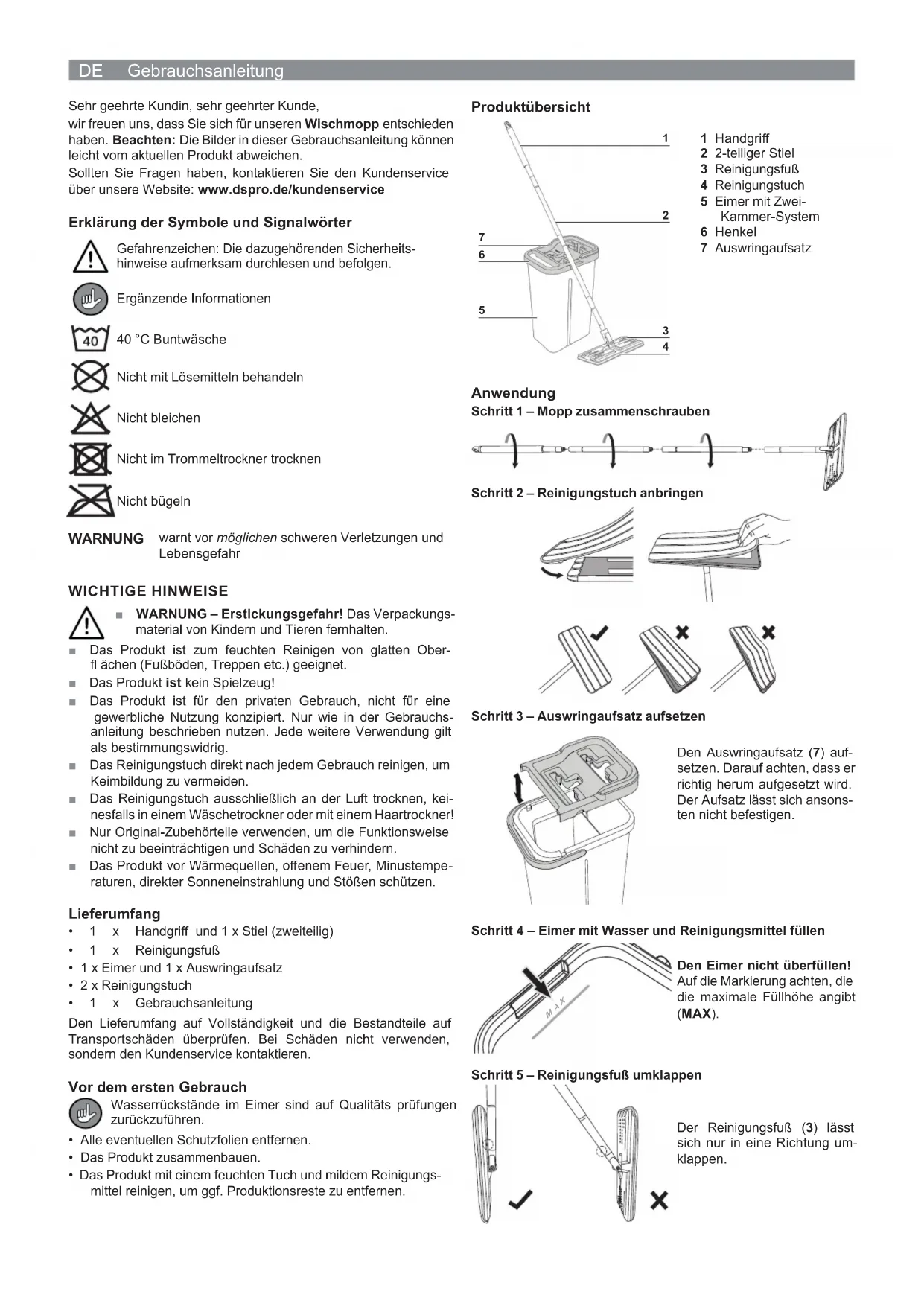DE Gebrauchsanleitung Sehr geehrte Kundin, sehr geehrter Kunde, wir freuen uns, dass Sie sich für unseren Wischmopp entschieden haben. Beachten: Die Bilder in dieser Gebrauchsanleitung können leicht vom aktuellen Produkt abweichen. Sollten Sie Fragen haben, kontaktieren Sie den Kundenservice über unsere Website: www.dspro.de/kundenservice Erklärung der Symbole und Signalwörter Gefahrenzeichen: Die dazugehörenden Sicherheits- hinweise aufmerksam durchlesen und befolgen. Ergänzende Informationen 40 °C Buntwäsche Nicht mit Lösemitteln behandeln Nicht bleichen Nicht im Trommeltrockner trocknen Nicht bügeln WARNUNG warnt vor möglichen schweren Verletzungen und Lebensgefahr WICHTIGE HINWEISE ■ WARNUNG – Erstickungsgefahr! Das Verpackungs- material von Kindern und Tieren fernhalten. ■ Das Produkt ist zum feuchten Reinigen von glatten Ober- fl ächen (Fußböden, Treppen etc.) geeignet. ■ Das Produkt ist kein Spielzeug! ■ Das Produkt ist für den privaten Gebrauch, nicht für eine gewerbliche Nutzung konzipiert. Nur wie in der Gebrauchs- anleitung beschrieben nutzen. Jede weitere Verwendung gilt als bestimmungswidrig. ■ Das Reinigungstuch direkt nach jedem Gebrauch reinigen, um Keimbildung zu vermeiden. ■ Das Reinigungstuch ausschließlich an der Luft trocknen, kei- nesfalls in einem Wäschetrockner oder mit einem Haartrockner! ■ Nur Original-Zubehörteile verwenden, um die Funktionsweise nicht zu beeinträchtigen und Schäden zu verhindern. ■ Das Produkt vor Wärmequellen, off enem Feuer, Minustempe- raturen, direkter Sonneneinstrahlung und Stößen schützen. Lieferumfang