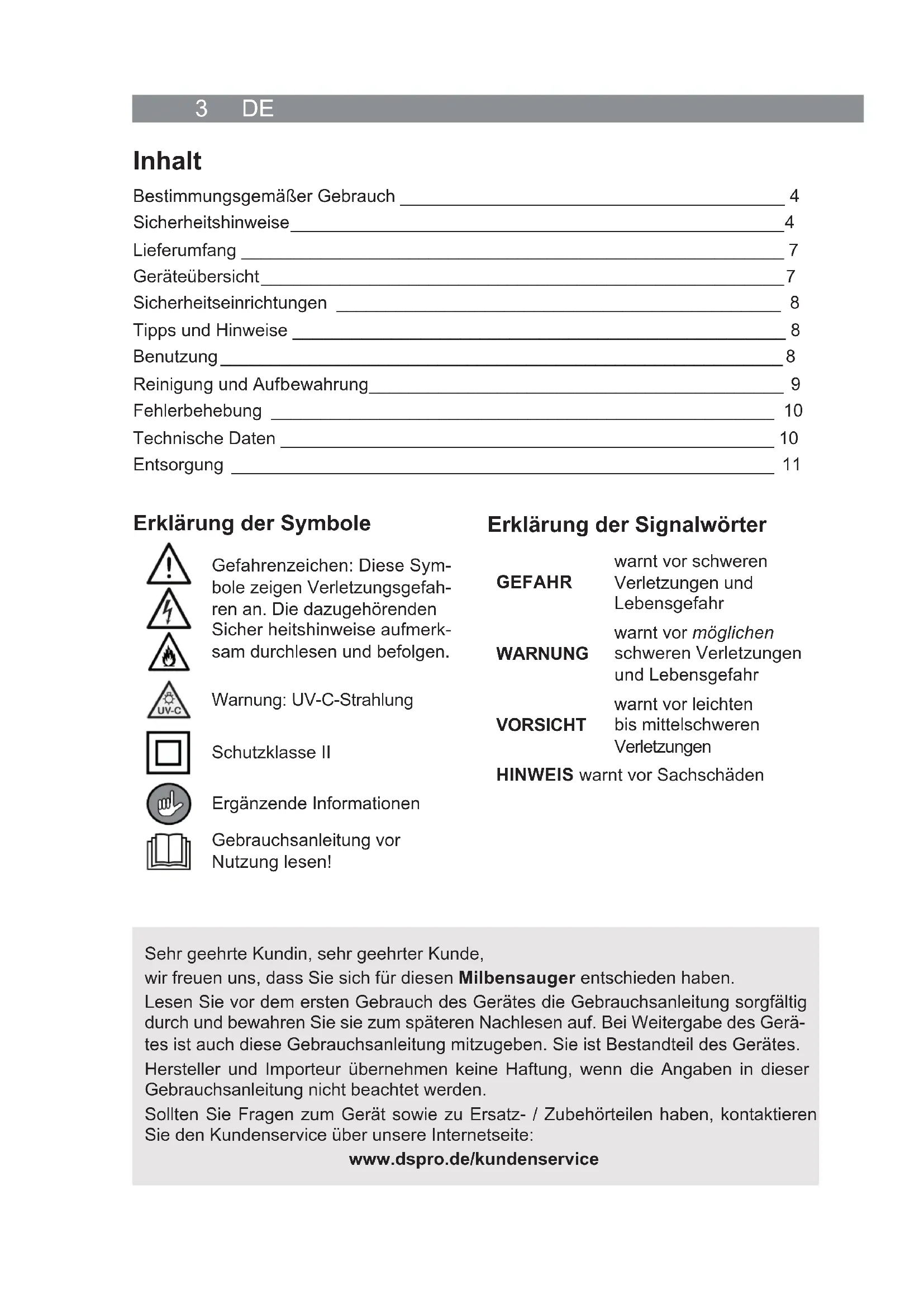 Gebruiksaanwijzing vanaf pagina 293 DE Sehr geehrte Kundin, sehr geehrter Kunde, wir freuen uns, dass Sie sich für diesen Milbensauger entschieden haben. Lesen Sie vor dem ersten Gebrauch des Gerätes die Gebrauchsanleitung sorgfältig durch und bewahren Sie sie zum späteren Nachlesen auf. Bei Weitergabe des Gerä- tes ist auch diese Gebrauchsanleitung mitzugeben. Sie ist Bestandteil des Gerätes. Hersteller und Importeur übernehmen keine Haftung, wenn die Angaben in dieser Gebrauchsanleitung nicht beachtet werden. Sollten Sie Fragen zum Gerät sowie zu Ersatz- / Zubehörteilen haben, kontaktieren Sie den Kundenservice über unsere Internetseite: www.dspro.de/kundenservice Erklärung der Symbole Gefahrenzeichen: Diese Sym- bole zeigen Verletzungsgefah- ren an. Die dazugehörenden Sicher heitshinweise aufmerk- sam durchlesen und befolgen. Warnung: UV-C-Strahlung Schutzklasse II Ergänzende Informationen Gebrauchsanleitung vor Nutzung lesen! Erklärung der Signalwörter GEFAHR warnt vor schweren Verletzungen und Lebensgefahr WARNUNG warnt vor möglichen schweren Verletzungen und Lebensgefahr VORSICHT warnt vor leichten bis mittelschweren Verletzungen HINWEIS warnt vor Sachschäden Inhalt Bestimmungsgemäßer Gebrauch _______________________________________ 4 Sicherheitshinweise __________________________________________________ 4 Lieferumfang _______________________________________________________ 7 Geräteübersicht _____________________________________________________ 7 Sicherheitseinrichtungen _____________________________________________ 8 Tipps und Hinweise __________________________________________________ 8 Benutzung _________________________________________________________ 8 Reinigung und Auf b ewahrung __________________________________________ 9 Fehlerbehebung ___________________________________________________ 10 Technische Daten __________________________________________________ 10 Entsorgung _______________________________________________________ 11DE 4 Bestimmungsgemäßer Gebrauch
