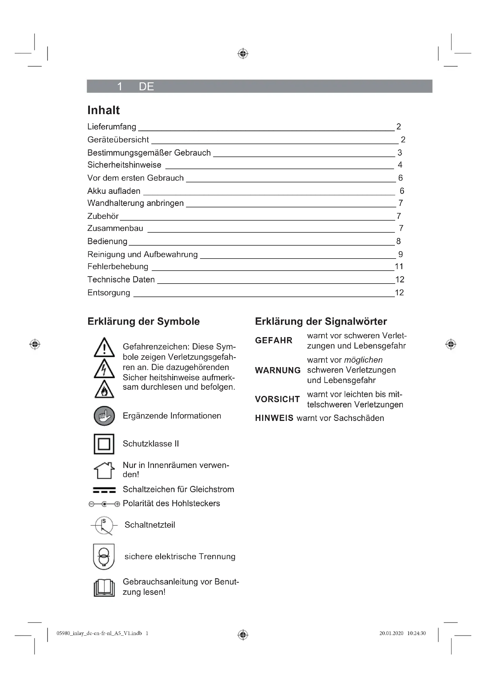 Schaltnetzteil sichere elektrische Trennung Gebrauchsanleitung vor Benut- zung lesen! Erklärung der Signalwörter GEFAHR warnt vor schweren Verlet- zungen und Lebensgefahr WARNUNG warnt vor möglichen schweren Verletzungen und Lebensgefahr VORSICHT warnt vor leichten bis mit- telschweren Verletzungen HINWEIS warnt vor Sachschäden 05980_inlay_de-en-fr-nl_A5_V1.indb 105980_inlay_de-en-fr-nl_A5_V1.indb 1 20.01.2020 10:24:3020.01.2020 10:24:30DE 2 Lieferumfang A Bürstendüse B Fugendüse C Halterung für Bürsten- und Fugendüse D Wandhalterung (inkl. Befestigungsmaterial) E Netzteil F Motoreinheit / Hauptgerät G Akku H Verlängerungsrohr I Mikrofaser-Bodendüse mit LEDs