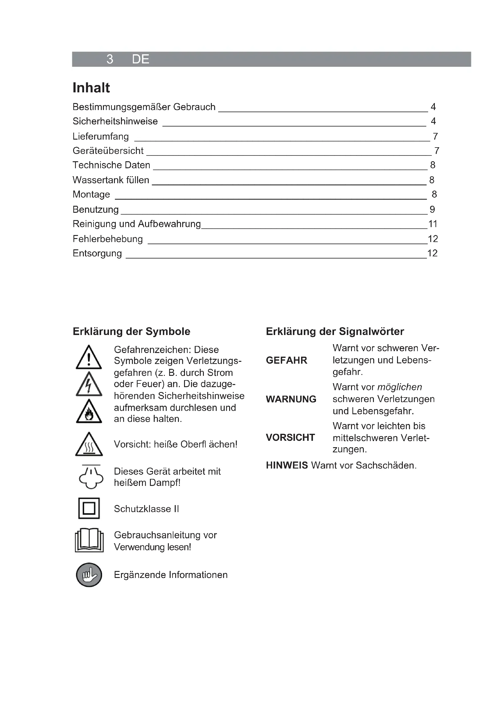 VORSICH: heißer Dampf! Das Gerät arbeitet mit weißem Dampf! Das Gerät mit Vorsicht bedieten.