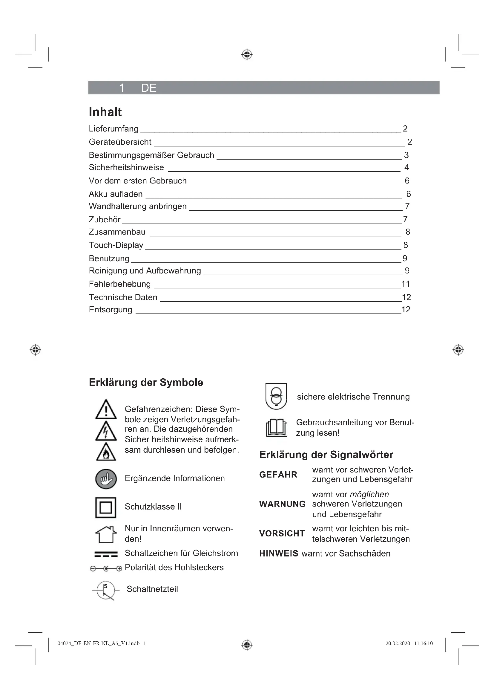 Schaltnetzteil sichere elektrische Trennung Gebrauchsanleitung vor Benut- zung lesen! Erklärung der Signalwörter GEFAHR warnt vor schweren Verlet- zungen und Lebensgefahr WARNUNG warnt vor möglichen schweren Verletzungen und Lebensgefahr VORSICHT warnt vor leichten bis mit- telschweren Verletzungen HINWEIS warnt vor Sachschäden 04074_DE-EN-FR-NL_A5_V1.indb 104074_DE-EN-FR-NL_A5_V1.indb 1 20.02.2020 11:16:1020.02.2020 11:16:10DE 2 Lieferumfang (Abbildungen siehe vordere Ausklappseite) A Netzteil B Wandhalterung (inkl. Befestigungsmaterial) C Fugendüse D Kombidüse E Motoreinheit F Akku G Verlängerungsrohr H Mikrofaser-Bodendüse mit LEDs