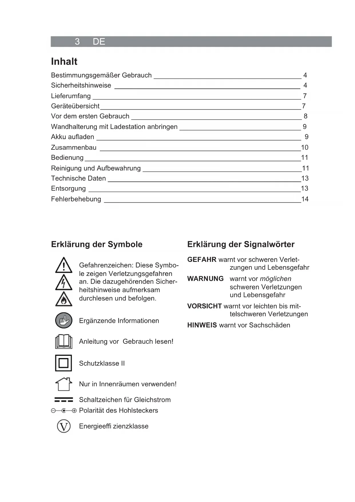 Gebruiksaanwijzing Vanaf pagina 39 091073 DE Inhalt Bestimmungsgemäßer Gebrauch _______________________________________ 4 Sicherheitshinweise _________________________________________________ 4 Lieferumfang _______________________________________________________ 7 Geräteübersicht _____________________________________________________ 7 Vor dem ersten Gebrauch _____________________________________________ 8 Wandhalterung mit Ladestation anbringen ________________________________ 9 Akku aufl aden ______________________________________________________ 9 Zusammenbau _____________________________________________________10 Bedienung _________________________________________________________11 Reinigung und Aufbewahrung __________________________________________11 Technische Daten ___________________________________________________13 Entsorgung ________________________________________________________13 Fehlerbehebung ____________________________________________________14 Erklärung der Symbole Gefahrenzeichen: Diese Symbo- le zeigen Verletzungsgefahren an. Die dazugehörenden Sicher- heitshinweise aufmerksam durchlesen und befolgen. Ergänzende Informationen Anleitung vor Gebrauch lesen! Schutzklasse II Nur in Innenräumen verwenden! Schaltzeichen für Gleichstrom Polarität des Hohlsteckers