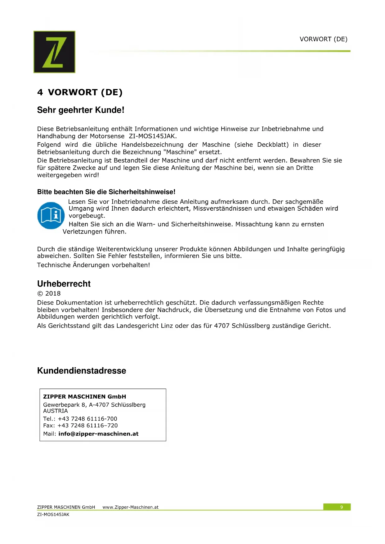 114 dB (A) Vibration/ vibration / vibráció / Vibracija / Vibracija / Vibrations ~10,21 m/s² k:1,5m/s² Maximale Schnittbreite / max. cutting width / maximális vágásszélesség / Maksimalna širina reza / Maksimalna širina rezanja / Largeur de coupe maximale 430 mm Fadenlänge / thread length / szálhossz / Dolžina nitke / Duljina niti/ longueur de fil 4 m Fadenstärke / thread thickness / szálerősség / Debelina nitke / Debljina niti / Épaisseur de fil Ø 2,4 mm Mähmesser 3 Zahn / 3-tooth blade dimension / 3-fogas kés /3-zobni nož / Nož za košnju s 3 zupca / Lame 3 dents Ø255 x Ø25,4 x 1,4mm Mähmesser 8 Zahn / 8-tooth blade dimension / 8-fogas kés /8-zobni nož / Nož za košnju s 8 zubaca / Lame 8 dents Ø255 x Ø25,4 x 1,4mmVORWORT (DE) ZIPPER MASCHINEN GmbH www.Zipper-Maschinen.at 9 ZI-MOS145JAK 4 VORWORT (DE) Sehr geehrter Kunde! Diese Betriebsanleitung enthält Informationen und wichtige Hinweise zur Inbetriebnahme und Handhabung der Motorsense ZI-MOS145JAK. Folgend wird die übliche Handelsbezeichnung der Maschine (siehe Deckblatt) in dieser Betriebsanleitung durch die Bezeichnung "Maschine" ersetzt. Die Betriebsanleitung ist Bestandteil der Maschine und darf nicht entfernt werden. Bewahren Sie sie für spätere Zwecke auf und legen Sie diese Anleitung der Maschine bei, wenn sie an Dritte weitergegeben wird! Bitte beachten Sie die Sicherheitshinweise! Lesen Sie vor Inbetriebnahme diese Anleitung aufmerksam durch. Der sachgemäße Umgang wird Ihnen dadurch erleichtert, Missverständnissen und etwaigen Schäden wird vorgebeugt. Halten Sie sich an die Warn- und Sicherheitshinweise. Missachtung kann zu ernsten Verletzungen führen. Durch die ständige Weiterentwicklung unserer Produkte können Abbildungen und Inhalte geringfügig abweichen. Sollten Sie Fehler feststellen, informieren Sie uns bitte. Technische Änderungen vorbehalten! Urheberrecht © 2018 Diese Dokumentation ist urheberrechtlich geschützt. Die dadurch verfassungsmäßigen Rechte bleiben vorbehalten! Insbesondere der Nachdruck, die Übersetzung und die Entnahme von Fotos und Abbildungen werden gerichtlich verfolgt. Als Gerichtsstand gilt das Landesgericht Linz oder das für 4707 Schlüsslberg zuständige Gericht.