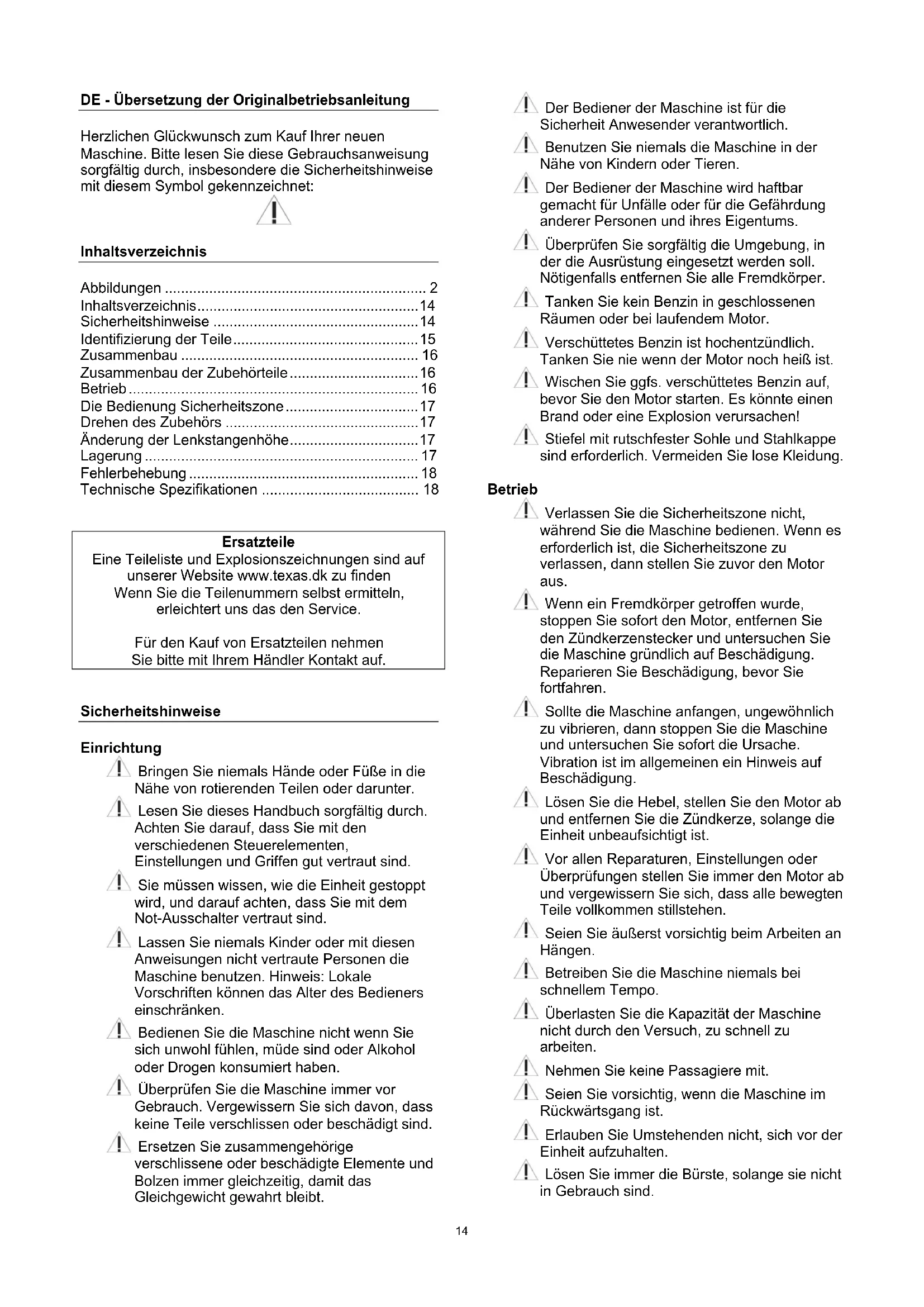 Ersatzteile Eine Teileliste und Explosionszeichnungen sind auf unserer Website www.texas.dk zu finden Wenn Sie die Teilenummern selbst ermitteln, erleichtert uns das den Service. Für den Kauf von Ersatzteilen nehmen Sie bitte mit Ihrem Händler Kontakt auf.