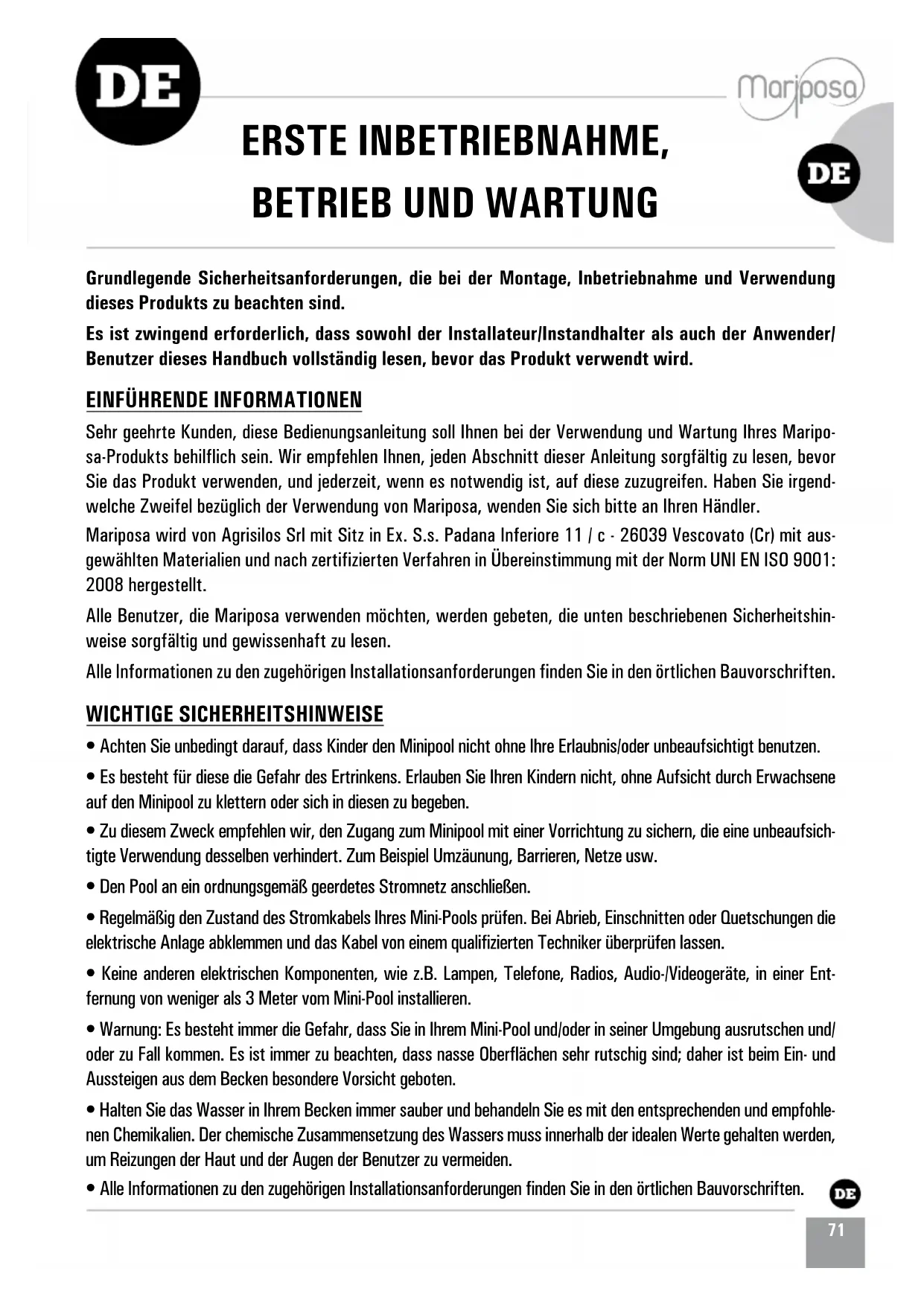 Die Montage (in dieser speziellen Anleitung beschrieben) und die Inbetriebnahme von Mariposa dürfen nur von qualifiziertem Personal durchgeführt werden; aus diesem Grund lehnt der Unterzeichnende jede Verant- wortung ab, wenn: a) Die Installation, die elektrischen Anschlüsse und der erste Start (Testlauf) des Pools nicht von techni- schem Personal, das in der Lage ist, die durchgeführten Arbeiten auch zu zertifizieren und zu garantieren, durchgeführt wurde. b) Die Normen und Vorschriften in Bezug auf die Elektroinstallationen der Gebäude, die in dem Staat gelten, in dem die Installation durchgeführt wird, nicht eingehalten werden; c) Für die Installation ungeeignete und/oder nicht zertifizierte Materialien verwendet werden; d) Falsche Eingriffe durchgeführt werden, die den Schutzgrad elektrischer Geräte verringern oder den Schutz gegen Stromschläge aufgrund direkter oder indirekter Kontakte ändern oder auch Isolationsbedingungen, Ableitströme und abnormale Überhitzung verursachen; e) Komponenten oder Teile des Produkts hinsichtlich seiner Werkseigenschaften geändert oder modifiziert werden, wodurch die Haftung des Herstellers und die gewährte Garantie effektiv ungültig werden; f) Das Produkt wurde von nicht autorisiertem Personal repariert und/oder es wurden nicht originale Ersatz- teile verwendet, die nicht ausdrücklich vom Hersteller autorisiert wurden; g) Bei Aufstellung im Innenbereich (Indoor) ist zu beachten, dass durch Verdunstung des Wassers eine sehr hohe Luftfeuchtigkeit entstehen kann. In solchen Fällen wird darauf hingewiesen, dass eine natürliche oder künstliche Belüftung zur Aufrechterhaltung des persönlichen Wohlbefindens und zur Reduzierung von Sach- schäden beiträgt. Gre lehnt jede Verantwortung für Schäden ab, die durch übermäßige Luftfeuchtigkeit ver- ursacht werden. Gewicht leeres Becken kg Wasserspiegel cm Max Grundfläche
