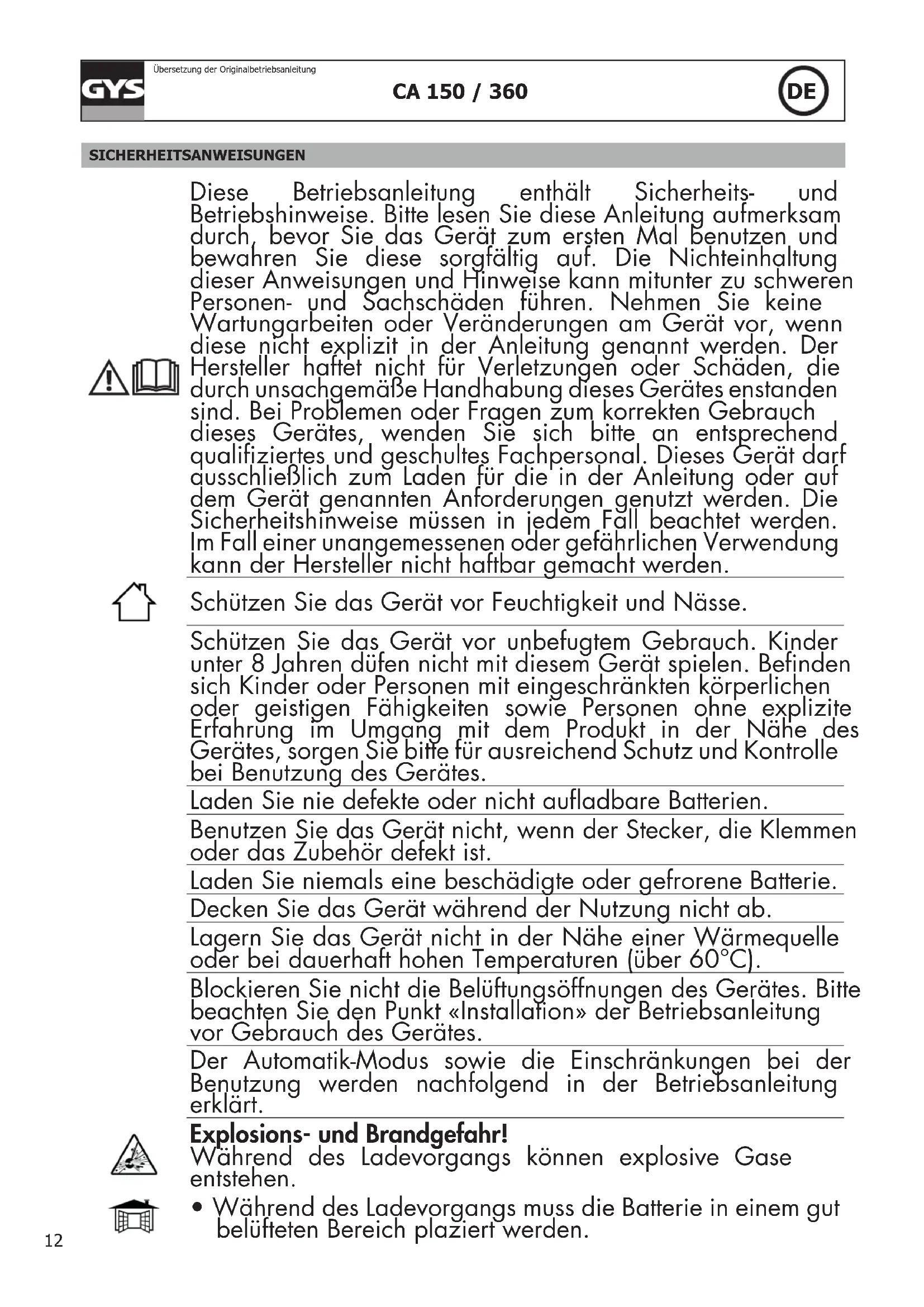 - Während des Ladevorgangs muss die Batterie in einem gut belüfteten Bereich plaziert werden.13 CA 150 / 360
