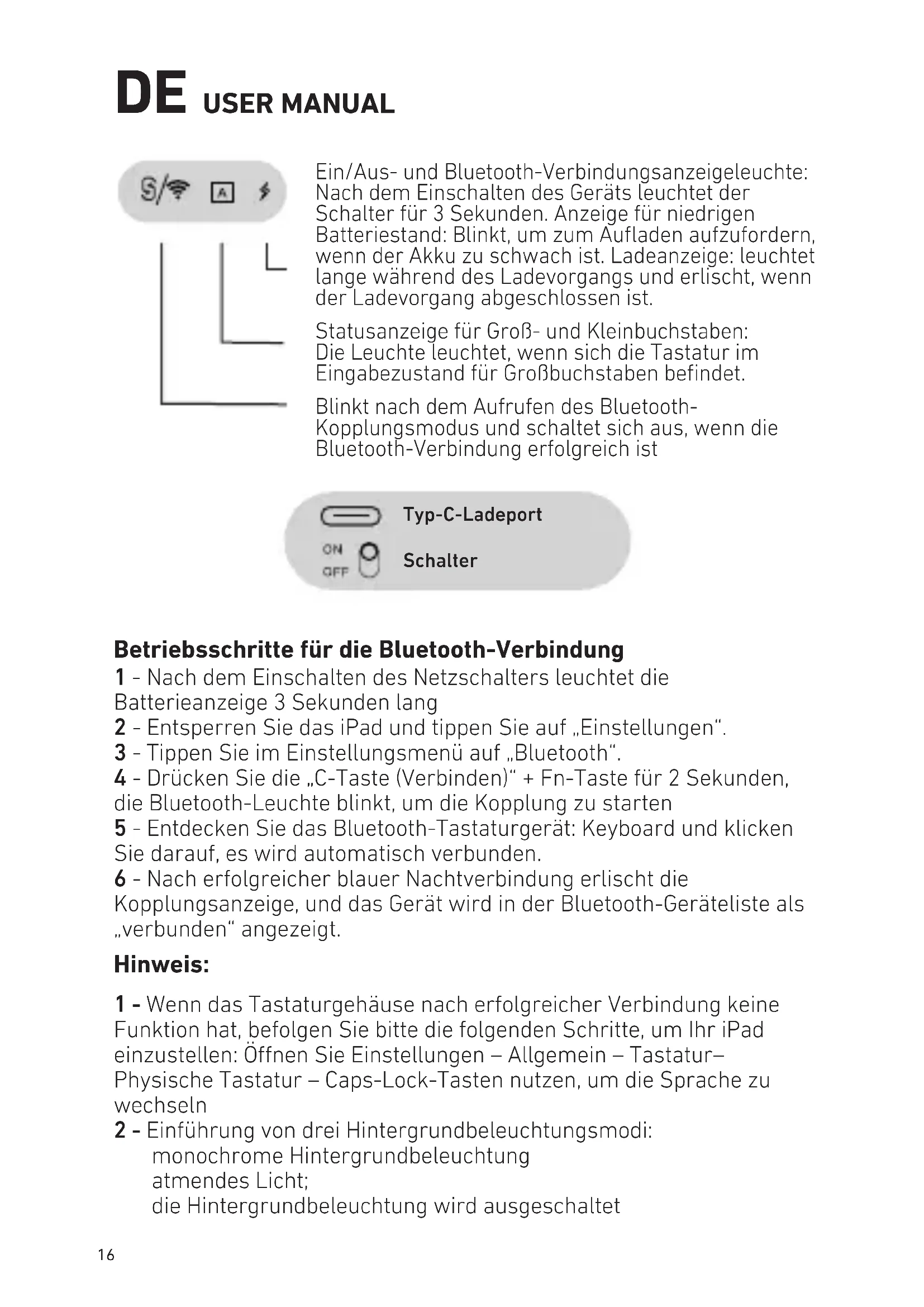 Funktion hat, befolgen Sie bitte die folgenden Schritte, um Ihr iPad einzustellen: Önen Sie Einstellungen – Allgemein – Tastatur– Physische Tastatur – Caps-Lock-Tasten nutzen, um die Sprache zu wechseln