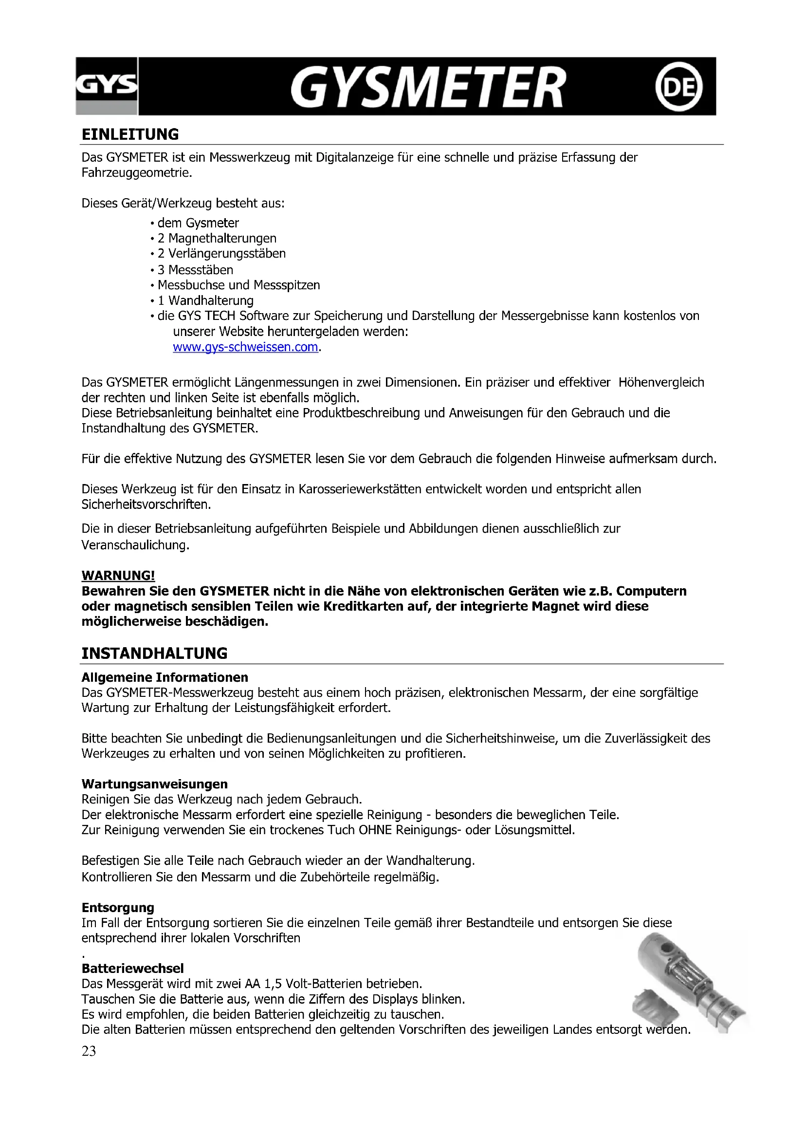 - die GYS TECH Software zur Speicherung und Darstellung der Messergebnisse kann kostenlos von unserer Website heruntergeladen werden: www.gys-schweissen.com. Das GYSMETER ermöglicht Längenmessungen in zwei Dimensionen. Ein präziser und effektiver Höhenvergleich der rechten und linken Seite ist ebenfalls möglich. Diese Betriebsanleitung beinhaltet eine Produktbeschreibung und Anweisungen für den Gebrauch und die Instandhaltung des GYSMETER. Für die effektive Nutzung des GYSMETER lesen Sie vor dem Gebrauch die folgenden Hinweise aufmerksam durch. Dieses Werkzeug ist für den Einsatz in Karosseriewerkstätten entwickelt worden und entspricht allen Sicherheitsvorschriften. Die in dieser Betriebsanleitung aufgeführten Beispiele und Abbildungen dienen ausschließlich zur Veranschaulichung. WARNUNG! Bewahren Sie den GYSMETER nicht in die Nähe von elektronischen Geräten wie z.B. Computern oder magnetisch sensiblen Teilen wie Kreditkarten auf, der integrierte Magnet wird diese möglicherweise beschädigen. INSTANDHALTUNG Allgemeine Informationen Das GYSMETER-Messwerkzeug besteht aus einem hoch präzisen, elektronischen Messarm, der eine sorgfältige Wartung zur Erhaltung der Leistungsfähigkeit erfordert. Bitte beachten Sie unbedingt die Bedienungsanleitungen und die Sicherheitshinweise, um die Zuverlässigkeit des Werkzeuges zu erhalten und von seinen Möglichkeiten zu profitieren. Wartungsanweisungen Reinigen Sie das Werkzeug nach jedem Gebrauch. Der elektronische Messarm erfordert eine spezielle Reinigung - besonders die beweglichen Teile. Zur Reinigung verwenden Sie ein trockenes Tuch OHNE Reinigungs- oder Lösungsmittel. Befestigen Sie alle Teile nach Gebrauch wieder an der Wandhalterung. Kontrollieren Sie den Messarm und die Zubehörteile regelmäßig. Entsorgung Im Fall der Entsorgung sortieren Sie die einzelnen Teile gemäß ihrer Bestandteile und entsorgen Sie diese entsprechend ihrer lokalen Vorschriften