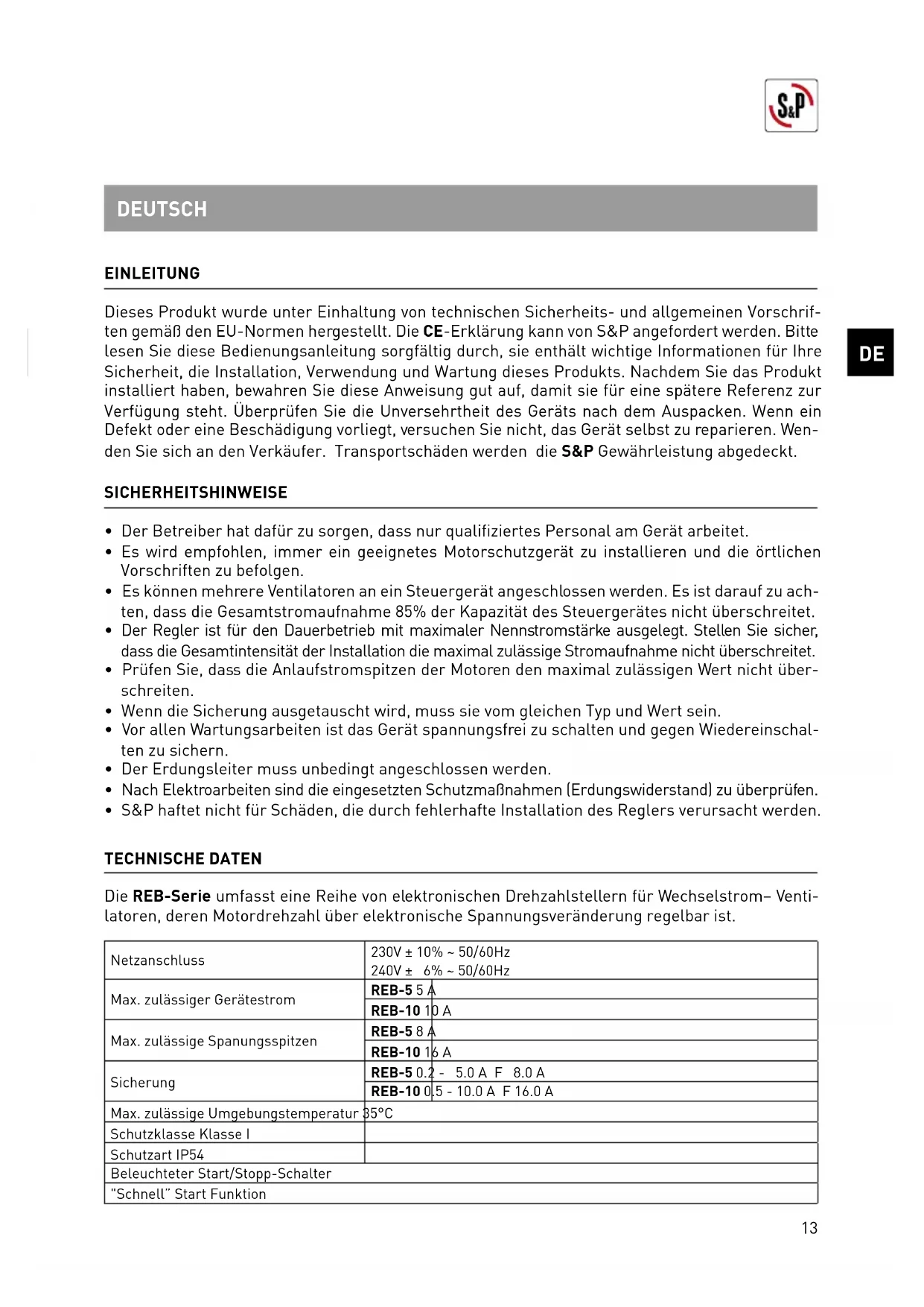 - S&P haftet nicht für Schäden, die durch fehlerhafte Installation des Reglers verursacht werden. TECHNISCHE DATEN Die REB-Serie umfasst eine Reihe von elektronischen Drehzahlstellern für Wechselstrom– Venti- latoren, deren Motordrehzahl über elektronische Spannungsveränderung regelbar ist. Netzanschluss 230V ± 10% ~ 50/60Hz 240V ± 6% ~ 50/60Hz Max. zulässiger Gerätestrom REB-5 5 A REB-10 10 A Max. zulässige Spanungsspitzen REB-5 8 A REB-10 16 A Sicherung