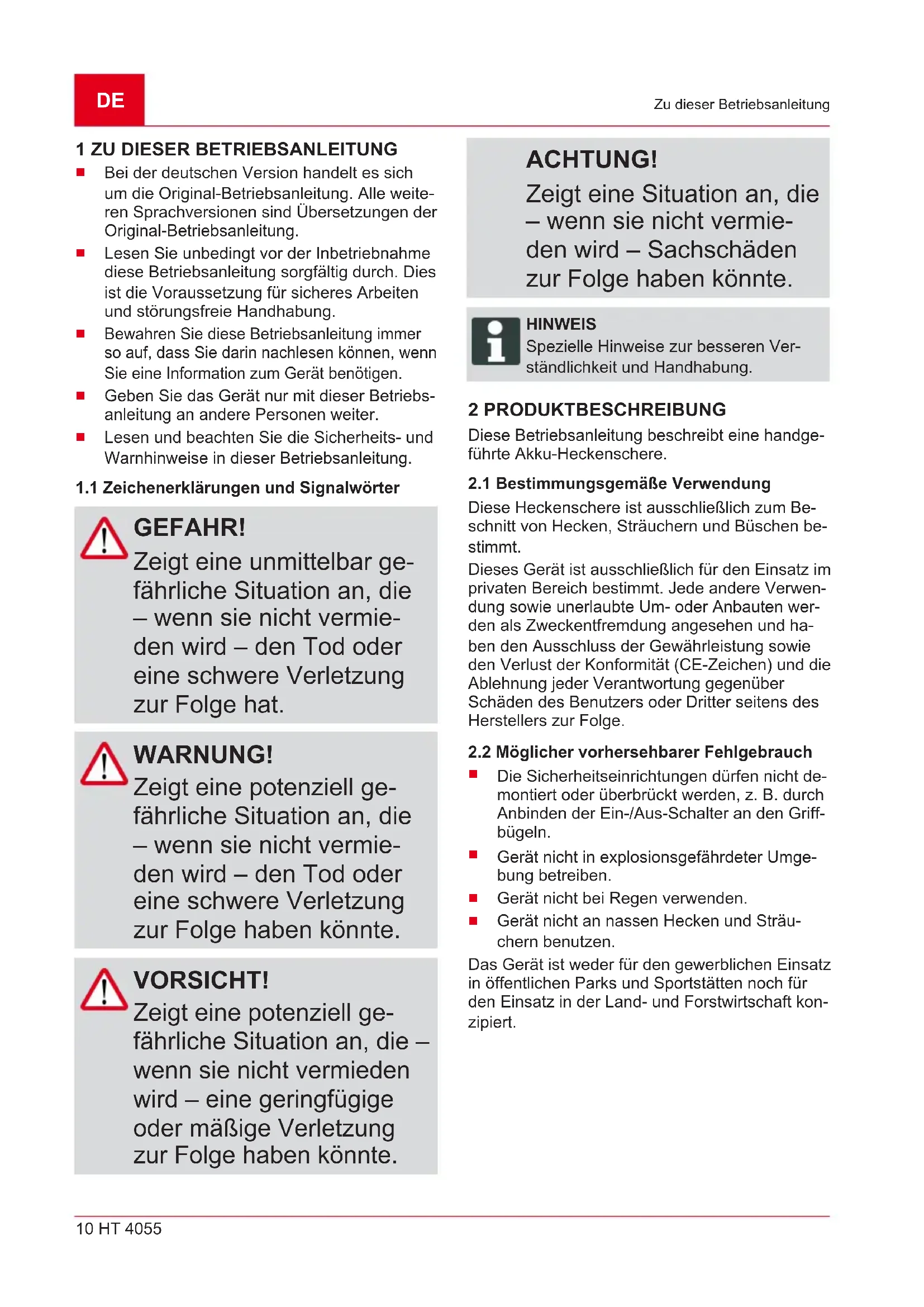 GEFAHR! Zeigt eine unmittelbar ge- fährliche Situation an, die – wenn sie nicht vermie- den wird – den Tod oder eine schwere Verletzung zur Folge hat. WARNUNG! Zeigt eine potenziell ge- fährliche Situation an, die – wenn sie nicht vermie- den wird – den Tod oder eine schwere Verletzung zur Folge haben könnte. VORSICHT! Zeigt eine potenziell ge- fährliche Situation an, die – wenn sie nicht vermieden wird – eine geringfügige oder mäßige Verletzung zur Folge haben könnte. ACHTUNG! Zeigt eine Situation an, die – wenn sie nicht vermie- den wird – Sachschäden zur Folge haben könnte. HINWEIS Spezielle Hinweise zur besseren Ver- ständlichkeit und Handhabung. 2 PRODUKTBESCHREIBUNG Diese Betriebsanleitung beschreibt eine handge- führte Akku-Heckenschere.