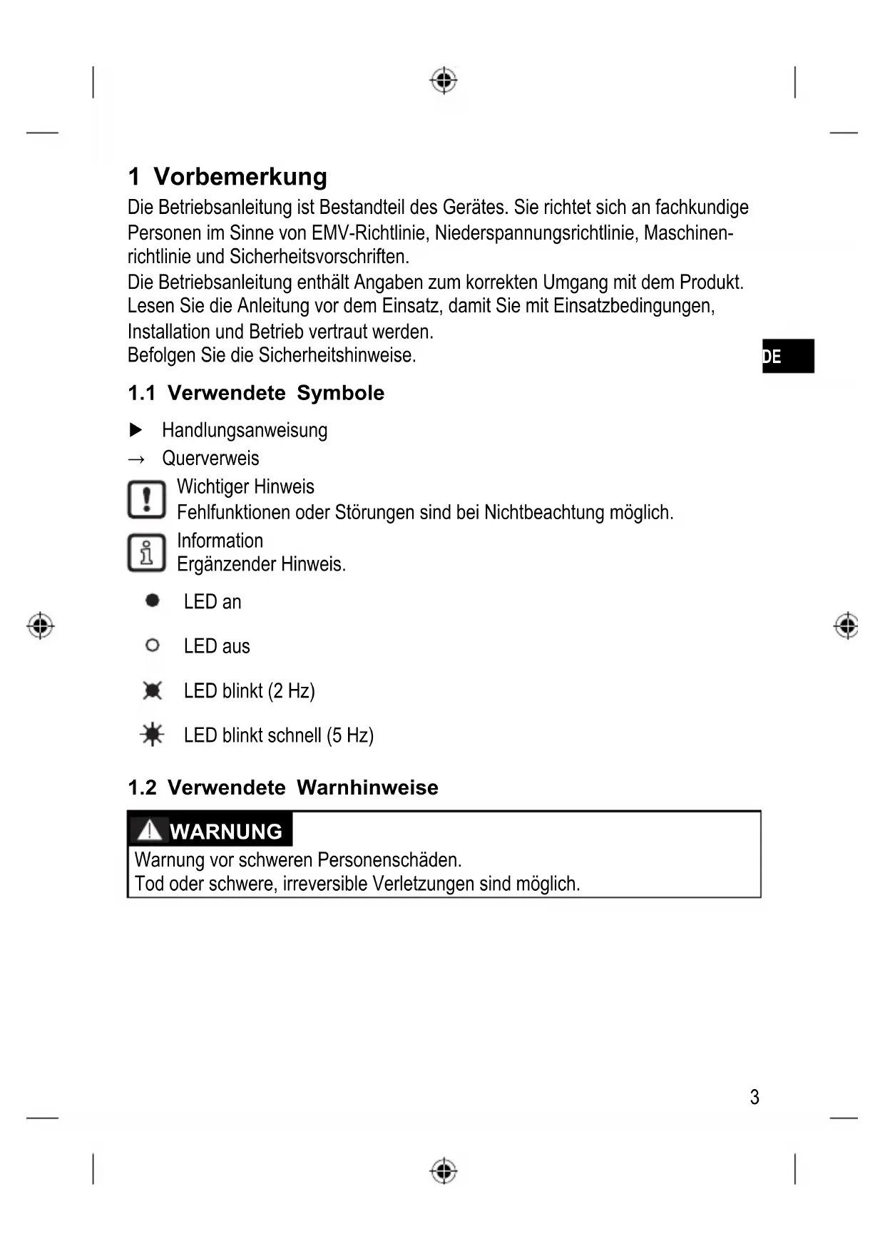 1 Vorbemerkung Die Betriebsanleitung ist Bestandteil des Gerätes. Sie richtet sich an fachkundige Personen im Sinne von EMV-Richtlinie, Niederspannungsrichtlinie, Maschinen- richtlinie und Sicherheitsvorschriften. Die Betriebsanleitung enthält Angaben zum korrekten Umgang mit dem Produkt. Lesen Sie die Anleitung vor dem Einsatz, damit Sie mit Einsatzbedingungen, Installation und Betrieb vertraut werden. Befolgen Sie die Sicherheitshinweise.
