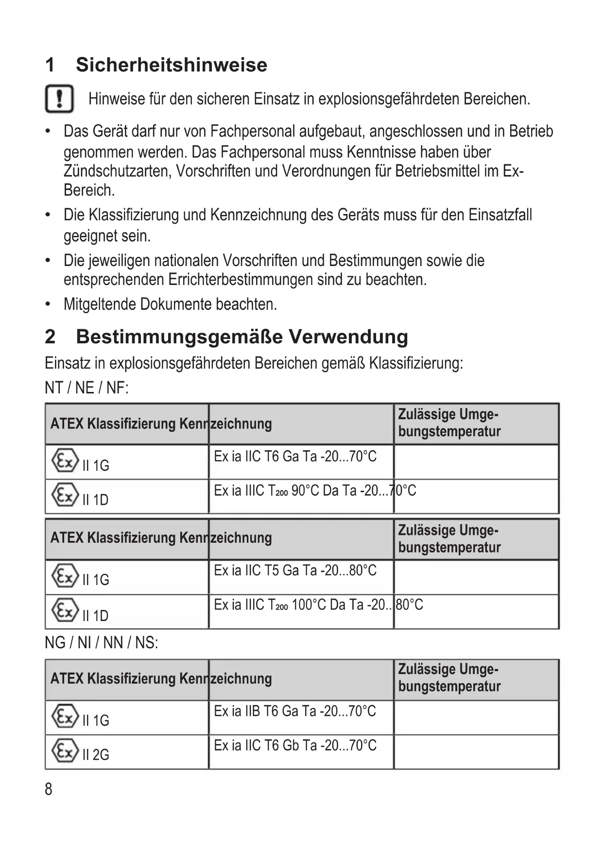 - Mitgeltende Dokumente beachten. 2 Bestimmungsgemäße Verwendung Einsatz in explosionsgefährdeten Bereichen gemäß Klassifizierung: NT / NE / NF: ATEX Klassifizierung Kennzeichnung Zulässige Umge- bungstemperatur II 1G Ex ia IIC T6 Ga Ta -20 p. 70