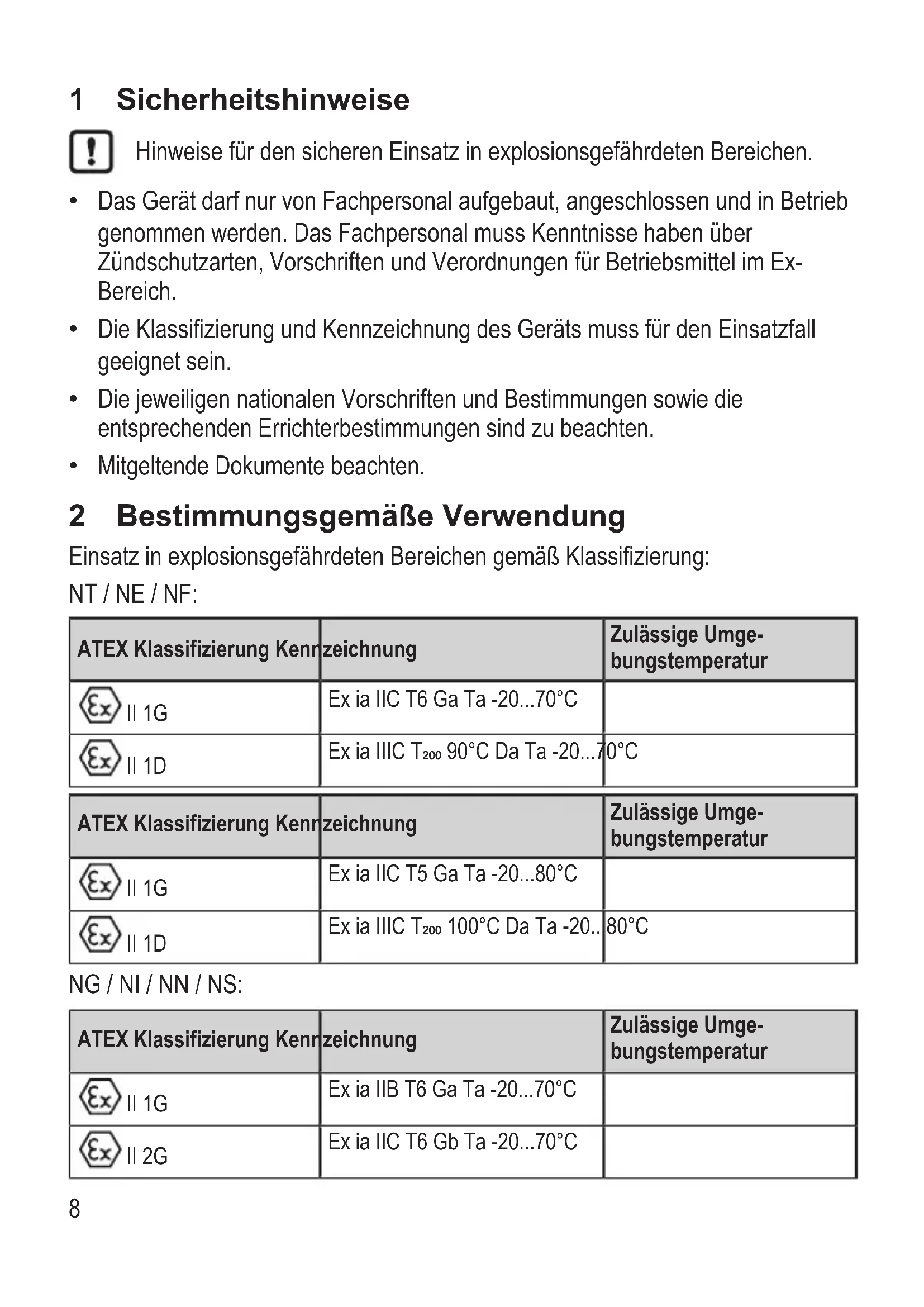 - Mitgeltende Dokumente beachten. 2 Bestimmungsgemäße Verwendung Einsatz in explosionsgefährdeten Bereichen gemäß Klassifizierung: NT / NE / NF: ATEX Klassifizierung Kennzeichnung Zulässige Umge- bungstemperatur II 1G Ex ia IIC T6 Ga Ta -20 p. 70