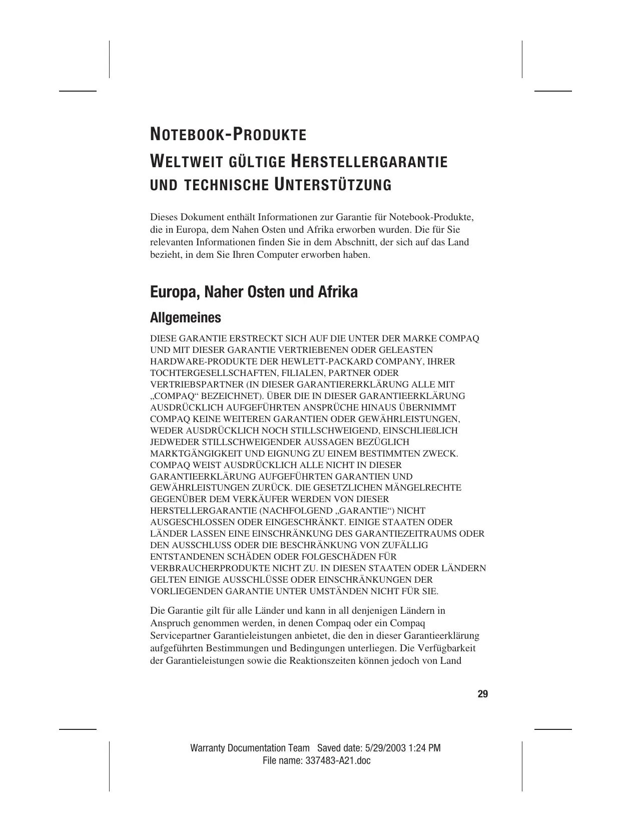 Dieses Dokument enthält Informationen zur Garantie für Notebook-Produkte, die in Europa, dem Nahen Osten und Afrika erworben wurden. Die für Sie relevanten Informationen finden Sie in dem Abschnitt, der sich auf das Land bezieht, in dem Sie Ihren Computer erworben haben. Europa, Naher Osten und Afrika Allgemeines DIESE GARANTIE ERSTRECKT SICH AUF DIE UNTER DER MARKE COMPAQ UND MIT DIESER GARANTIE VERTRIEBENEN ODER GELEASTEN
