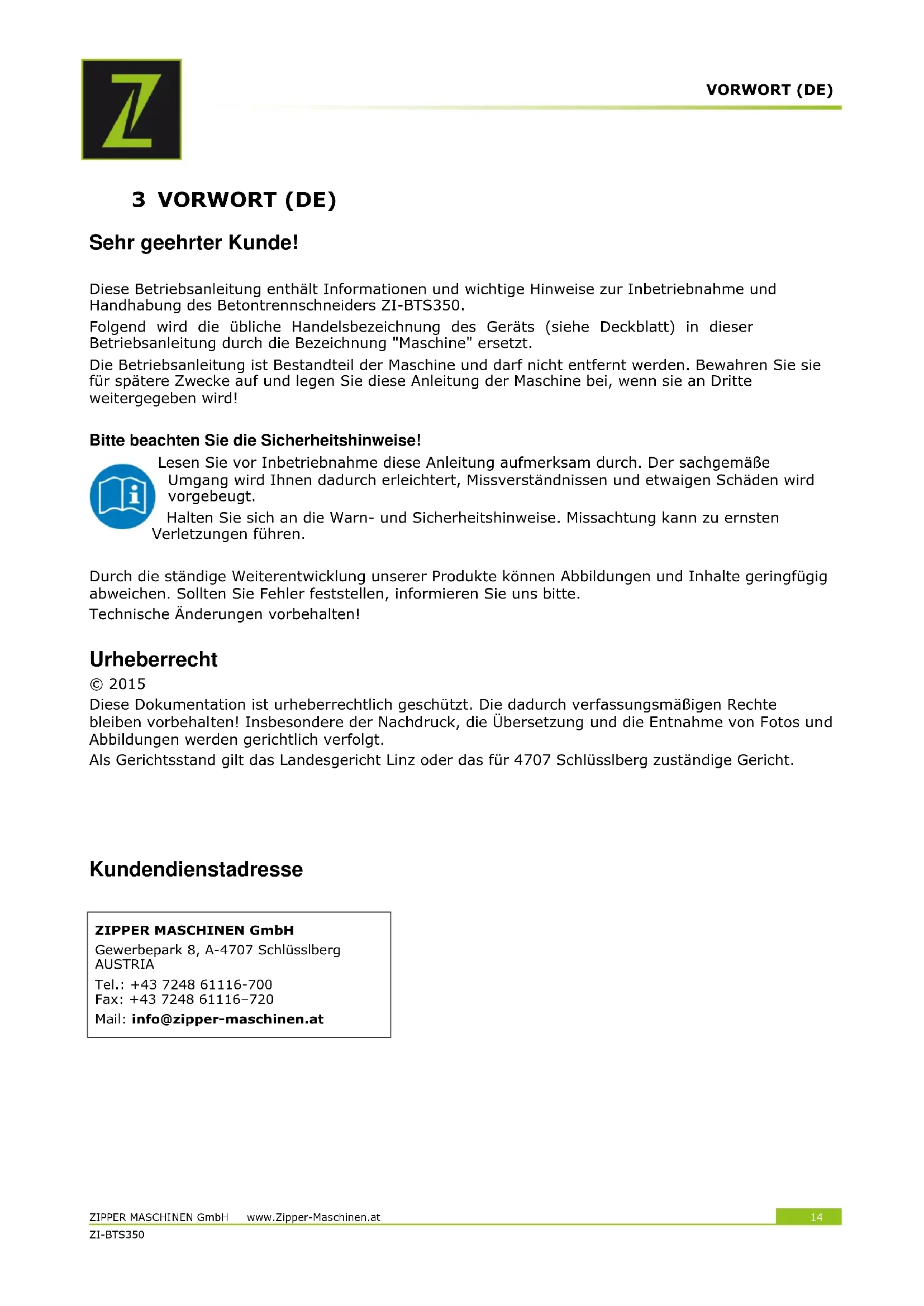 SRB Aparat pre ispravke ili privremenih pauza isključiti iz napona!VORWORT (DE) ZIPPER MASCHINEN GmbH www.Zipper-Maschinen.at 14 ZI-BTS350 3 VORWORT (DE) Sehr geehrter Kunde! Diese Betriebsanleitung enthält Informationen und wichtige Hinweise zur Inbetriebnahme und Handhabung des Betontrennschneiders ZI-BTS350. Folgend wird die übliche Handelsbezeichnung des Geräts (siehe Deckblatt) in dieser Betriebsanleitung durch die Bezeichnung "Maschine" ersetzt. Die Betriebsanleitung ist Bestandteil der Maschine und darf nicht entfernt werden. Bewahren Sie sie für spätere Zwecke auf und legen Sie diese Anleitung der Maschine bei, wenn sie an Dritte weitergegeben wird! Bitte beachten Sie die Sicherheitshinweise! Lesen Sie vor Inbetriebnahme diese Anleitung aufmerksam durch. Der sachgemäße Umgang wird Ihnen dadurch erleichtert, Missverständnissen und etwaigen Schäden wird vorgebeugt. Halten Sie sich an die Warn- und Sicherheitshinweise. Missachtung kann zu ernsten Verletzungen führen. Durch die ständige Weiterentwicklung unserer Produkte können Abbildungen und Inhalte geringfügig abweichen. Sollten Sie Fehler feststellen, informieren Sie uns bitte. Technische Änderungen vorbehalten! Urheberrecht © 2015 Diese Dokumentation ist urheberrechtlich geschützt. Die dadurch verfassungsmäßigen Rechte bleiben vorbehalten! Insbesondere der Nachdruck, die Übersetzung und die Entnahme von Fotos und Abbildungen werden gerichtlich verfolgt. Als Gerichtsstand gilt das Landesgericht Linz oder das für 4707 Schlüsslberg zuständige Gericht.