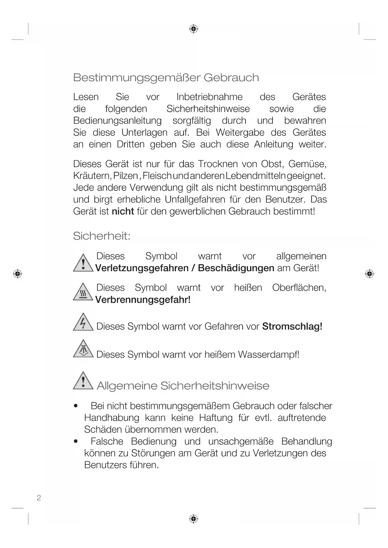 Bestimmungsgemäßer Gebrauch Lesen Sie vor Inbetriebnahme des Gerätes die folgenden Sicherheitshinweise sowie die Bedienungsanleitung sorgfältig durch und bewahren Sie diese Unterlagen auf. Bei Weitergabe des Gerätes an einen Dritten geben Sie auch diese Anleitung weiter. Dieses Gerät ist nur für das Trocknen von Obst, Gemüse, Kräutern, Pilzen , Fleisch und anderen Lebendmitteln geeignet. Jede andere Verwendung gilt als nicht bestimmungsgemäß und birgt erhebliche Unfallgefahren für den Benutzer. Das Gerät ist nicht für den gewerblichen Gebrauch bestimmt! Sicherheit: Dieses Symbol warnt vor allgemeinen Verletzungsgefahren / Beschädigungen am Gerät! Dieses Symbol warnt vor heißen Oberflächen, Verbrennungsgefahr! Dieses Symbol warnt vor Gefahren vor Stromschlag! Dieses Symbol warnt vor heißem Wasserdampf! Allgemeine Sicherheitshinweise
