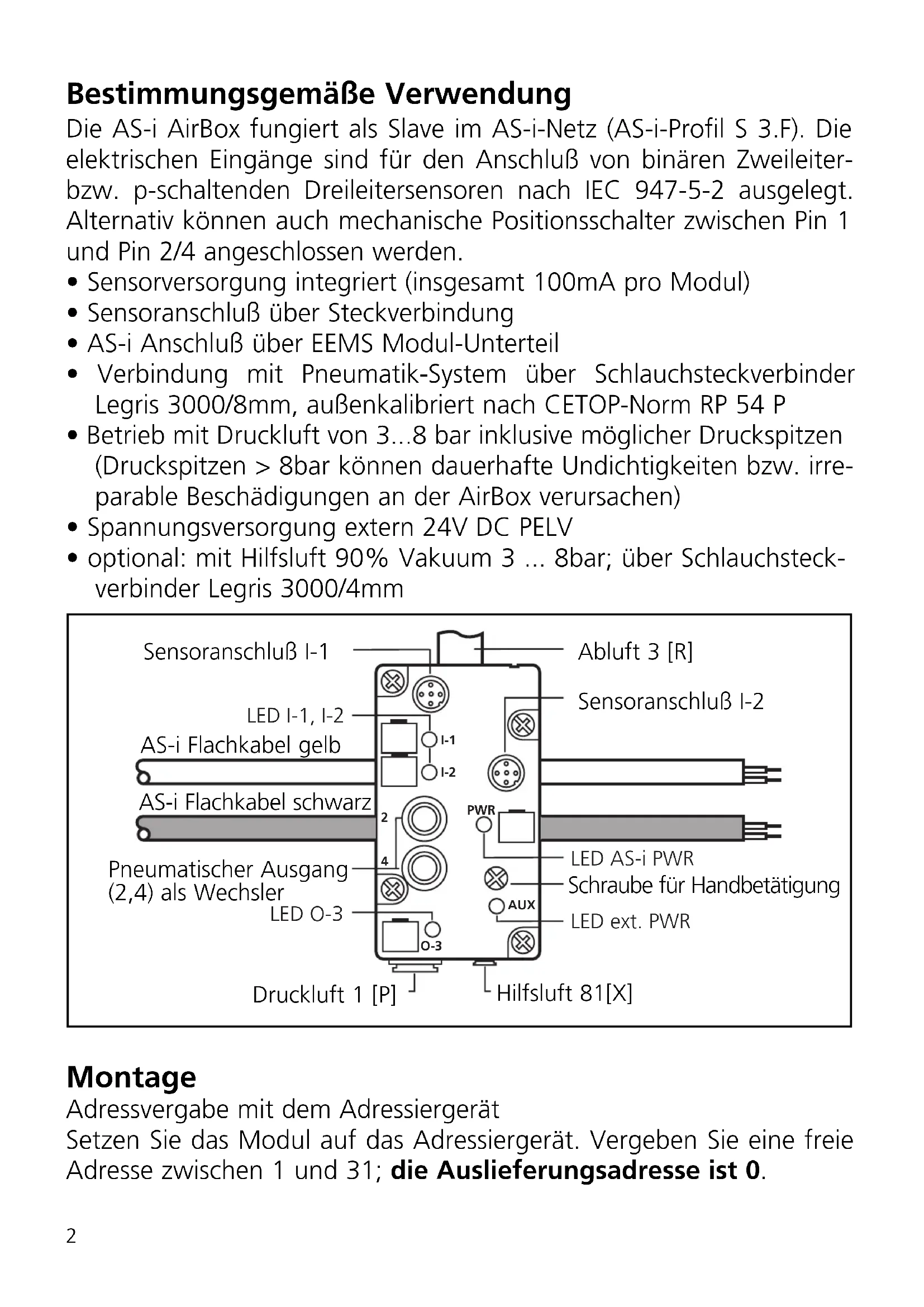 Sachnr. 701349/05 12/2004 Teile-Nr. 80360 IND.CONT.EQ. 92CABestimmungsgemäße Verwendung Die AS-i AirBox fungiert als Slave im AS-i-Netz (AS-i-Profil S 3.F). Die elektrischen Eingänge sind für den Anschluß von binären Zweileiter- bzw. p-schaltenden Dreileitersensoren nach IEC 947-5-2 ausgelegt. Alternativ können auch mechanische Positionsschalter zwischen Pin 1 und Pin 2/4 angeschlossen werden.
