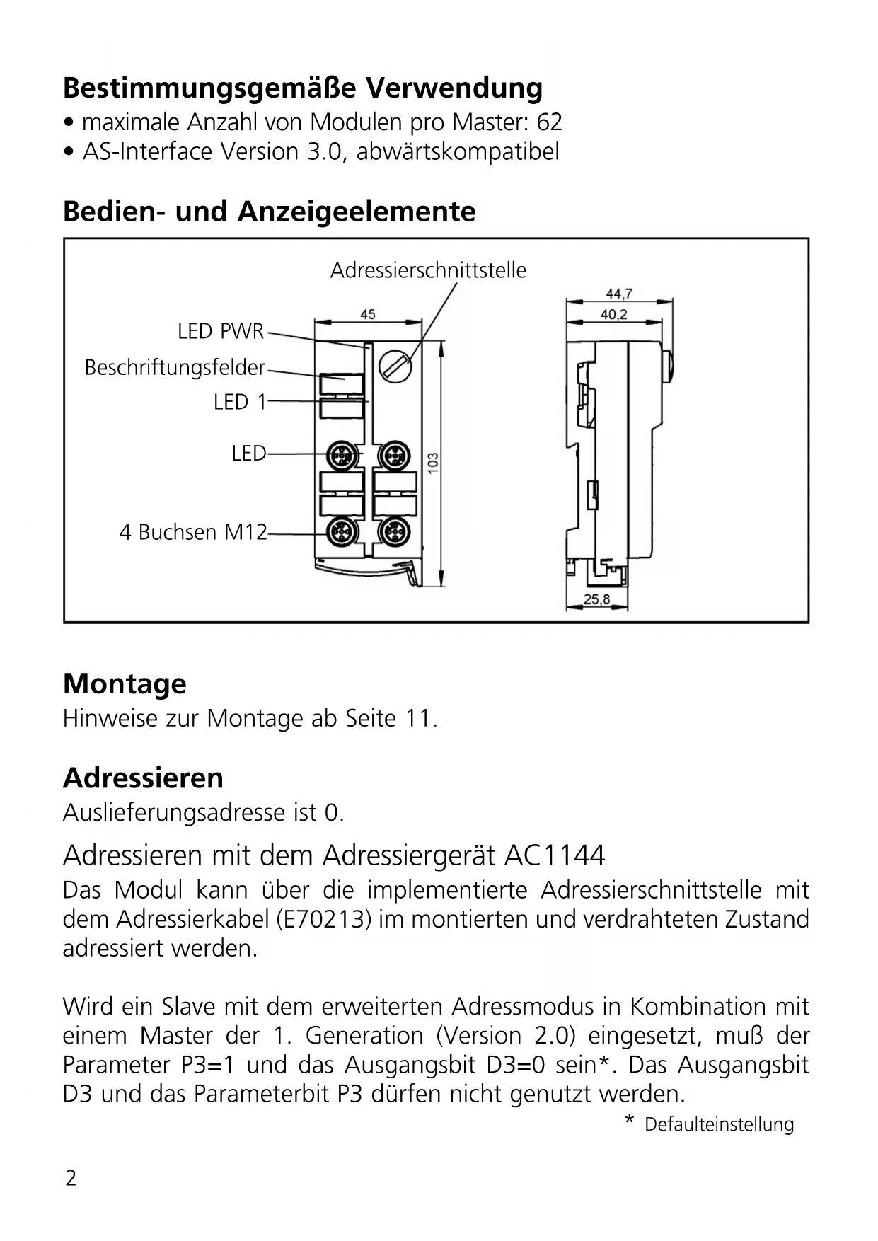 Wird ein Slave mit dem erweiterten Adressmodus in Kombination mit einem Master der 1. Generation (Version 2.0) eingesetzt, muß der Parameter P3=1 und das Ausgangsbit D3=0 sein*. Das Ausgangsbit D3 und das Parameterbit P3)dürfen nicht genutzt werden.