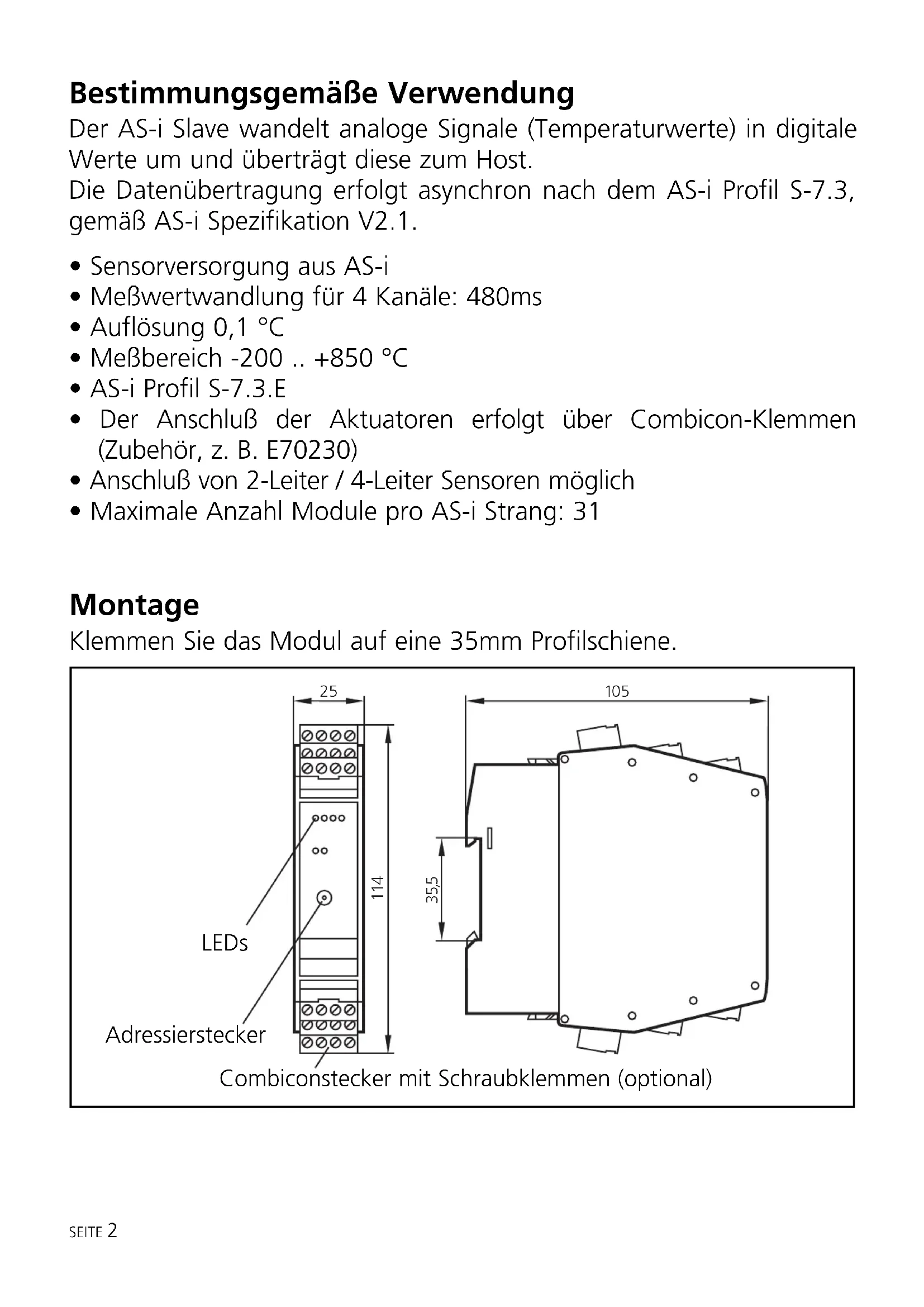 Montageanleitung Installation Instructions Notice de Montage AS-i Modul AS-i module Module AS-i AC2220 Sachnr. 7390386/00 09/2005Bestimmungsgemäße Verwendung Der AS-i Slave wandelt analoge Signale (Temperaturwerte) in digitale Werte um und überträgt diese zum Host. Die Datenübertragung erfolgt asynchron nach dem AS-i Profil S-7.3, gemäß AS-i Spezifikation V2.1.
