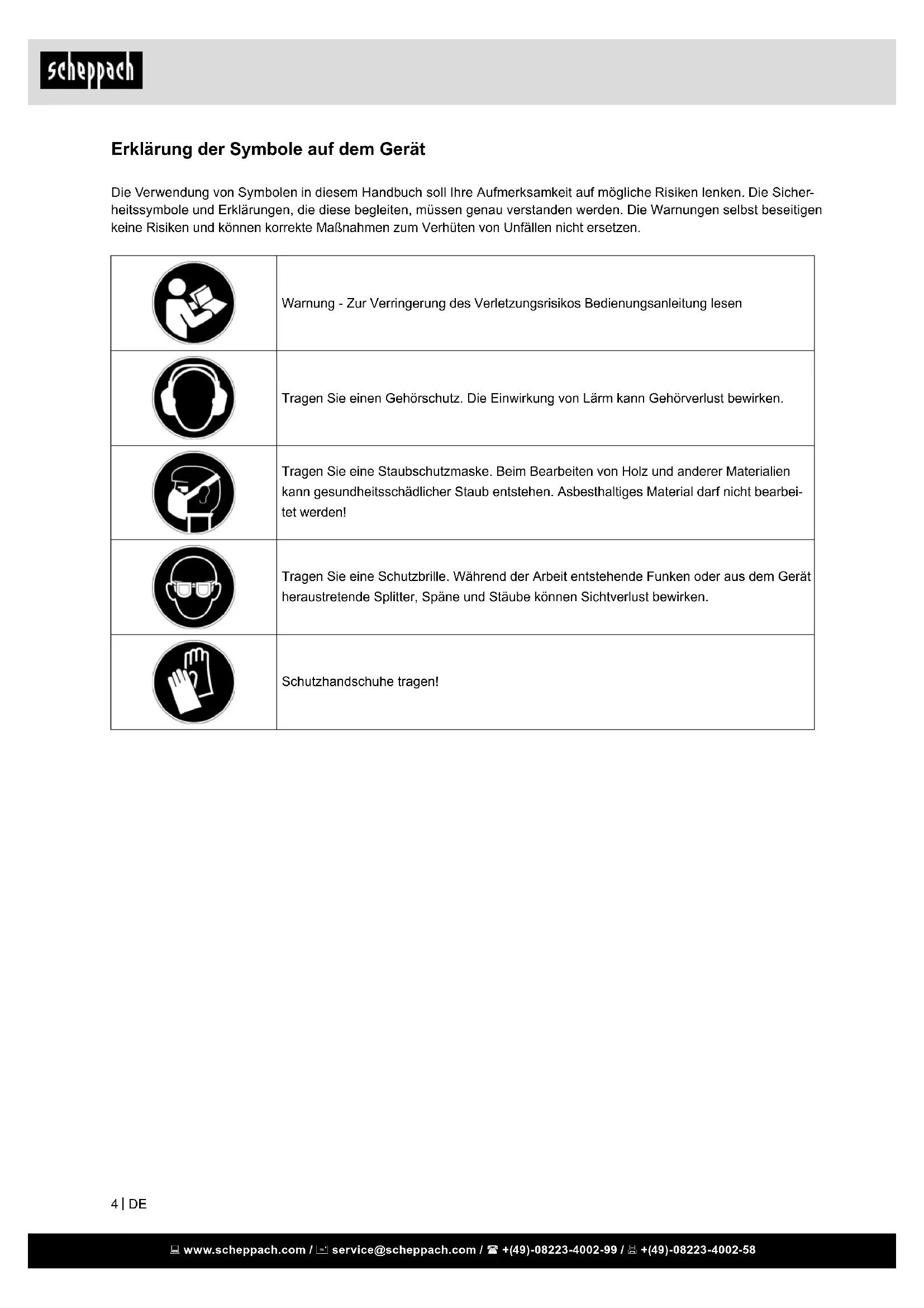 Erklärung der Symbole auf dem Gerät Die Verwendung von Symbolen in diesem Handbuch soll Ihre Aufmerksamkeit auf mögliche Risiken lenken. Die Sicher- heitssymbole und Erklärungen, die diese begleiten, müssen genau verstanden werden. Die Warnungen selbst beseitigen keine Risiken und können korrekte Maßnahmen zum Verhüten von Unfällen nicht ersetzen. Warnung - Zur Verringerung des Verletzungsrisikos Bedienungsanleitung lesen Tragen Sie einen Gehörschutz. Die Einwirkung von Lärm kann Gehörverlust bewirken. Tragen Sie eine Staubschutzmaske. Beim Bearbeiten von Holz und anderer Materialien kann gesundheitsschädlicher Staub entstehen. Asbesthaltiges Material darf nicht bearbei- tet werden! Tragen Sie eine Schutzbrille. Während der Arbeit entstehende Funken oder aus dem Gerät heraustretende Splitter, Späne und Stäube können Sichtverlust bewirken. Schutzhandschuhe tragen! www.scheppach.com / service@scheppach.com / +(49)-08223-4002-99 / +(49)-08223-4002-58
