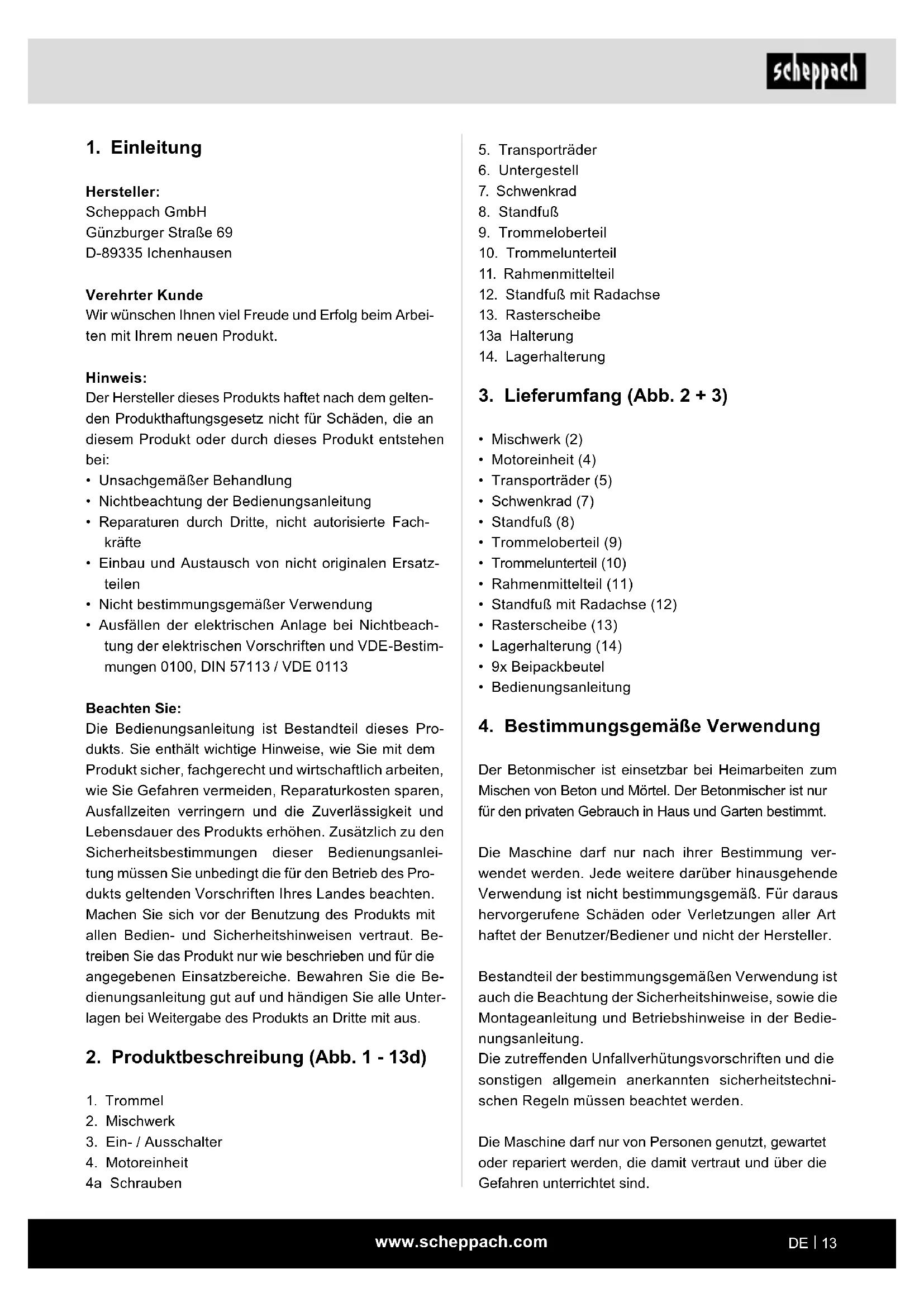 - Niemals bei eingeschalteter Maschine die Hände auf sich bewegende Teile der Maschine legen. Es besteht die Gefahr des Erfassens / Aufwickelns durch die rotierende Trommel bzw. rotierende Mischwerkzeuge. Eigenmächtige Veränderungen an der Maschine schließen eine Haftung des Herstellers für daraus re- sultierende Schäden aus. Die Maschine darf nur mit Originalteilen und Original- zubehör des Herstellers betrieben werden. Die Sicher- heits-, Arbeits- und Wartungsvorschriften des Herstel- lers sowie die in den Technischen Daten angegebenen Abmessungen müssen eingehalten werden. Bitte beachten Sie, dass unsere Geräte bestimmungs- gemäß nicht für den gewerblichen, handwerklichen oder industriellen Einsatz konstruiert wurden. Wir übernehmen keine Gewährleistung, wenn das Gerät in Gewerbe-, Handwerks- oder Industriebetrieben sowie bei gleichzusetzenden Tätigkeiten eingesetzt wird. Erklärung der Signalwörter in der Betriebsanleitung m Warnung Signalwort zur Kennzeichnung einer möglichen Gefährdungssituation, die, wenn sie nicht ver- mieden wird, den Tod oder eine schwere Verlet- zung zur Folge haben könnte. m GEFAHR Signalwort zur Kennzeichnung einer unmittel- bar bevorstehenden Gefährdungssituation, die, wenn sie nicht vermieden wird, den Tod oder ei- ne schwere Verletzung zur Folge hat. m VORSICHT Signalwort zur Kennzeichnung einer möglichen Gefährdungssituation, die, wenn sie nicht ver- mieden wird, eine geringfügige oder mäßige Verletzung zur Folge haben könnte. ACHTUNG Signalwort zur Kennzeichnung einer möglichen Gefährdungssituation, die, wenn sie nicht vermieden wird, Sachschäden am Produkt oder Eigentum/Besitz zur Folge haben könnte.www.scheppach.com