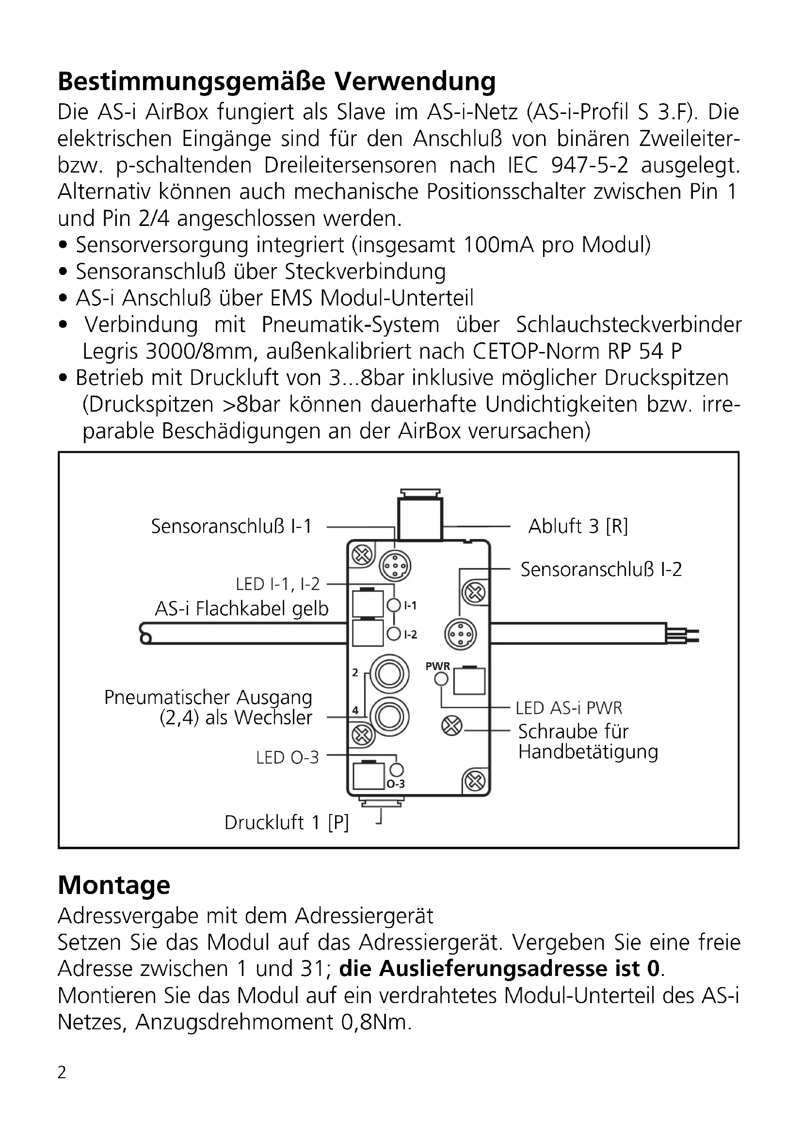Sachnr. 701462/03 06/2004 Teile-Nr.83.439Bestimmungsgemäße Verwendung Die AS-i AirBox fungiert als Slave im AS-i-Netz (AS-i-Profil S 3.F). Die elektrischen Eingänge sind für den Anschluß von binären Zweileiter- bzw. p-schaltenden Dreileitersensoren nach IEC 947-5-2 ausgelegt. Alternativ können auch mechanische Positionsschalter zwischen Pin 1 und Pin 2/4 angeschlossen werden.