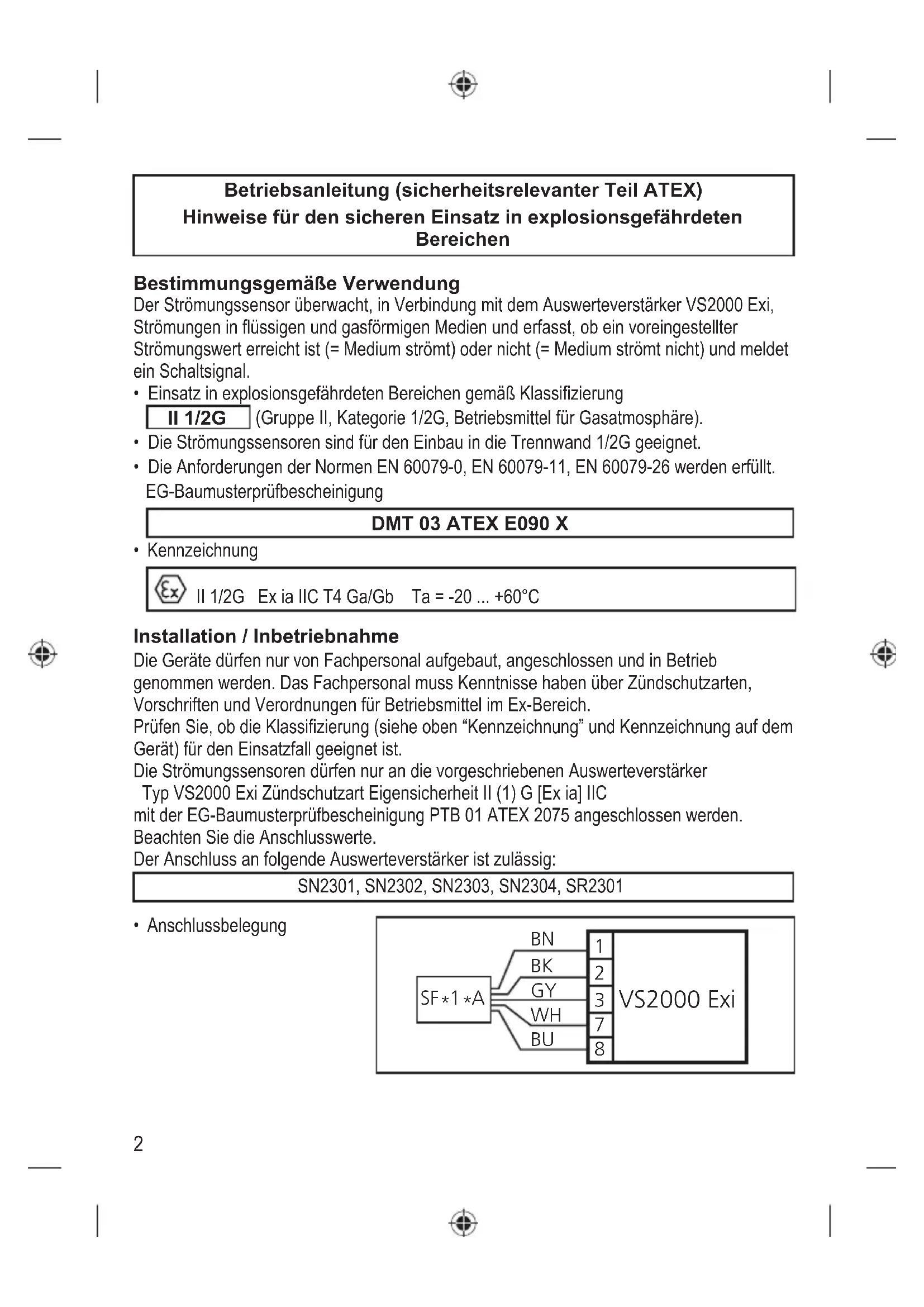 - Kennzeichnung II 1/2G Ex ia IIC T4 Ga/Gb Ta = -20 ... +60°C Installation / Inbetriebnahme Die Geräte dürfen nur von Fachpersonal aufgebaut, angeschlossen und in Betrieb genommen werden. Das Fachpersonal muss Kenntnisse haben über Zündschutzarten, Vorschriften und Verordnungen für Betriebsmittel im Ex-Bereich. Prüfen Sie, ob die Klassifizierung (siehe oben “Kennzeichnung” und Kennzeichnung auf dem Gerät) für den Einsatzfall geeignet ist. Die Strömungssensoren dürfen nur an die vorgeschriebenen Auswerteverstärker Typ VS2000 Exi Zündschutzart Eigensicherheit II (1) G [Ex ia] IIC mit der EG-Baumusterprüfbescheinigung PTB 01 ATEX 2075 angeschlossen werden. Beachten Sie die Anschlusswerte. Der Anschluss an folgende Auswerteverstärker ist zulässig: SN2301, SN2302, SN2303, SN2304, SR2301