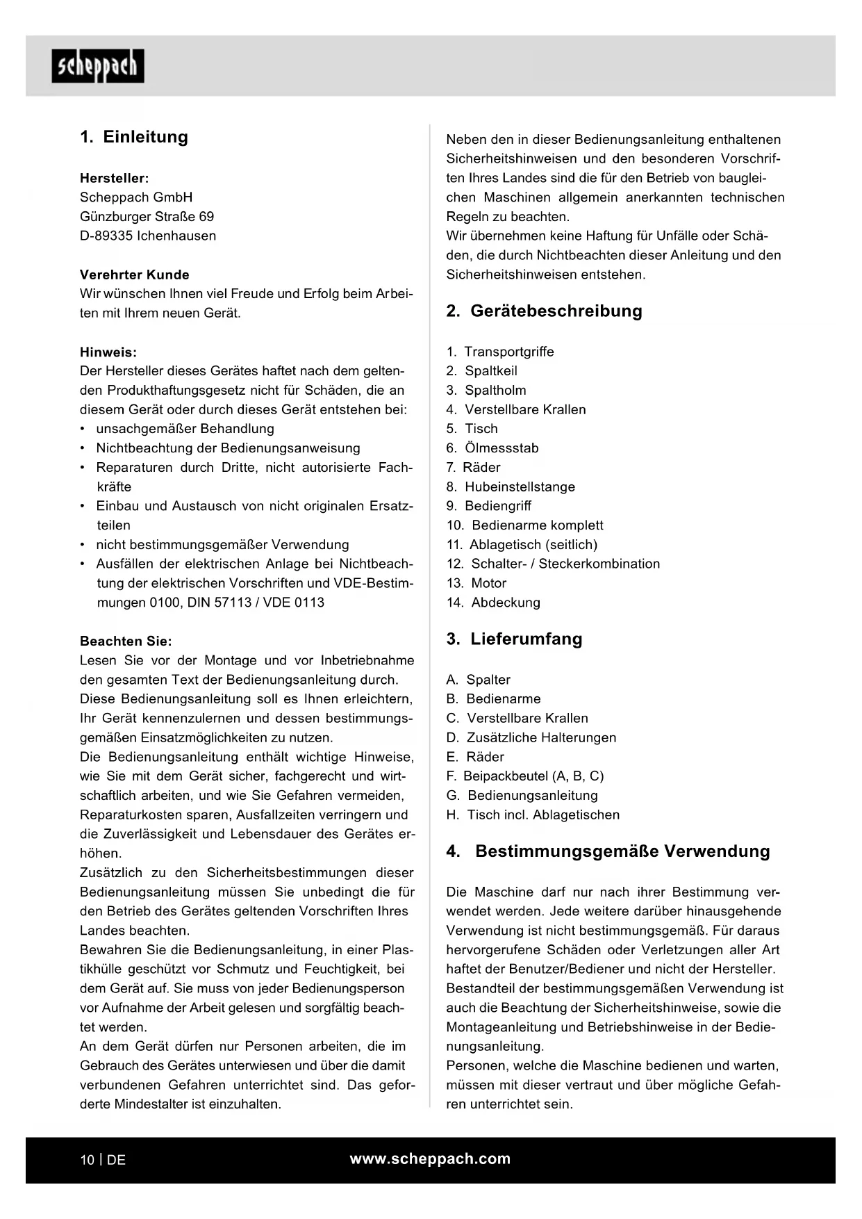Hersteller: Scheppach GmbH Günzburger Straße 69 D-89335 Ichenhausen Verehrter Kunde Wir wünschen Ihnen viel Freude und Erfolg beim Arbei- ten mit Ihrem neuen Gerät. Hinweis: Der Hersteller dieses Gerätes haftet nach dem gelten- den Produkthaftungsgesetz nicht für Schäden, die an diesem Gerät oder durch dieses Gerät entstehen bei: