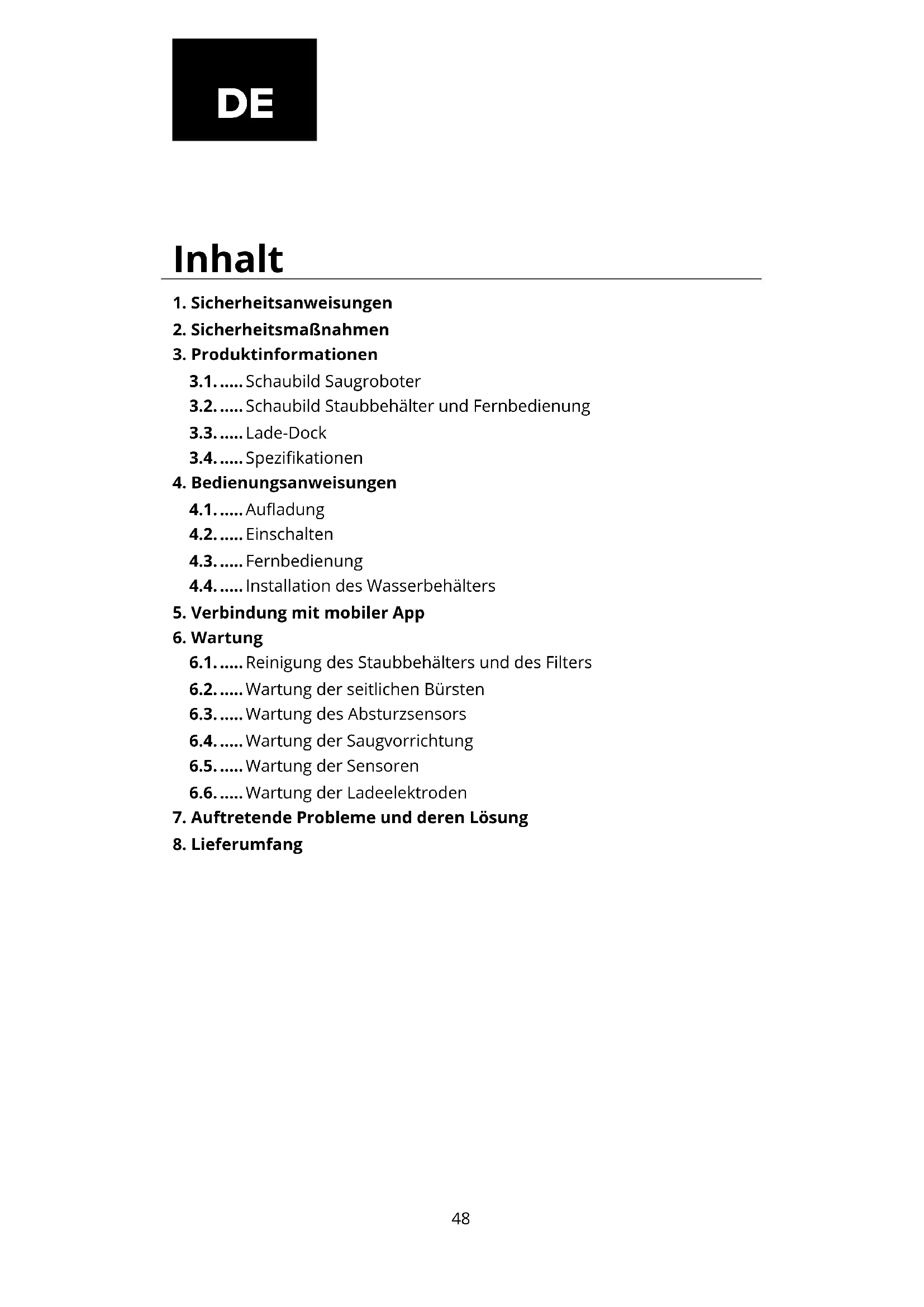 odereingedrungenemWassernichtfunktionsfähigist.51 2.Sicherheitsmaßnahmen LesenSiebittevordemEinsatzdesStaubsaugersdiefolgendenAnweisungen. Ladekabelundweitereauf demBodenverstreutekleinere GegenständekönnensichamGerät verfangenoderdiesesumwickeln. VergessenSienicht,diesevor Gebrauchzuentfernen. BitterollenSieTeppichfransenauf oderstellenSiesicher,dassdas GerätkeinenfeinhaarigenTeppich einsaugt. EntfernenSiebittedieweißen StreifenaufbeidenSeitender Stoßstange,ansonstenwirddas Gerätnichtordnungsgemäß funktionieren. UmdensicherenBetriebdes Gerätszugewährleisten,müssen AbsperrungenandenRändern platziertwerden.52 3.Produktinformationen